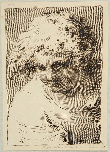 Editor: Georg Friedrich Schmidt's "Head of a Child" has such tenderness. I am struck by its intimate scale and the soft, reddish tones. What visual metaphors do you think this piece evokes? Curator: The child’s averted gaze, rendered in sanguine, speaks to innocence and perhaps vulnerability. The hatching technique, reminiscent of early engravings, imbues the work with a sense of history and fragility. Do you see any other symbols? Editor: Perhaps the flowing hair hints at freedom, contrasting with the tight control of the lines. Curator: Precisely. The artist uses familiar visual vocabulary to evoke universal feelings about childhood. Understanding these images helps us connect across time. Editor: I never thought of it that way. It's fascinating how those enduring symbols still resonate. Curator: Indeed, and appreciating this continuity enriches our experience of the artwork.