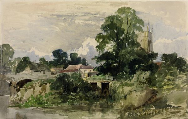 Editor: This watercolor is "Kenilworth Castle" by Peter De Wint. It's quite atmospheric, and the castle seems to blend into the landscape. What does this piece communicate to you? Curator: Consider the labor involved in both building the castle and then depicting it. De Wint is using readily available materials—paper, pigment, water—to represent a structure built with immense resources and labor. How does that inform our understanding of power and representation? Editor: That's a really interesting way to consider it. I hadn't thought about the socio-economic implications of the materials themselves. Curator: It highlights the divide between those who build and those who depict. Editor: Thanks, that makes me think about landscape painting differently now.
