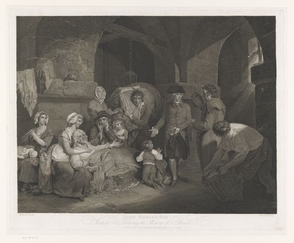 Editor: This is "Christ's Representation in the Temple" by Georg Friedrich Schmidt. It makes me think about how the light and shadow play across the different textures to create a very dramatic scene. What compositional elements stand out to you? Curator: Note the strategic arrangement of figures; observe how Schmidt positions some figures to kneel while others stand. How does this affect the composition? Editor: It seems to create a dynamic movement, like a wave flowing across the scene. Curator: Precisely. Schmidt uses this strategy to direct our gaze, underscoring the narrative within the representational space itself. Are you able to discern the relationship between light and form, and how they might contribute to this movement? Editor: Yes, the artist uses light and shadow to define the shapes and direct our eyes. Thank you. Curator: Indeed, a closer study of line and texture can reveal how Schmidt uses the formal elements to create an emotionally charged setting.
