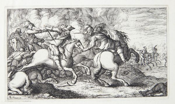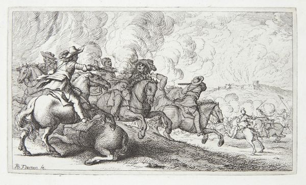Curator: Instantly, I get a sense of wildness, an uncontrolled surge forward, a frenetic energy that’s barely contained within the frame. Editor: And it really speaks to that chaotic period, doesn’t it? We’re looking at "Cavalry Chasing an Enemy" by Albert Flamen, an etching probably created sometime between 1620 and 1669. It depicts exactly what the title suggests, though I wonder which enemy we’re meant to be thinking of. Curator: The energy's almost cartoonish, isn't it? Exaggerated, like the horses are barely touching the ground. It feels less about historical accuracy and more about… theatrical performance. Editor: The drama is certainly amplified. Considering the period—marked by the Thirty Years' War and other conflicts—this image taps into the broader European obsession with militarism and the glorification of war. Though the details might be murky, these soldiers represent the machismo, power, and ultimately, the violence inherent in that culture. Curator: But is it really glorifying? The composition is almost overwhelming; those plumes of smoke feel suffocating. To me, it’s almost critical, a look at the disarray that combat brings, not really the ‘glory.’ Editor: Perhaps. Flamen’s choice of etching, the precise line work… it creates both distance and intimacy. We’re observing the action, but the close detail implicates us. It's difficult to turn away. Who benefits when war is sanitized? Flamen’s baroque aesthetic choices allow him to deliver that difficult message through dramatic visual components, such as heightened emotions or obscured events, rather than clear instructive rhetoric. Curator: That is definitely true: that smoky atmosphere, a palpable uncertainty hangs over everything. War and political agenda are both murky matters. Even without the glory, it's fascinating, right? All this detail from just lines etched onto a plate. Editor: It’s a potent reminder that even in ostensibly historical art, ideology and artistic vision converge and are very hard to tease apart. History never feels as unbiased as what you think a plain etching suggests. Curator: And maybe that ambiguity is the point: war, glory, power...it's all a tangled mess, expressed with incredible energy. Editor: Exactly, and recognizing the tangle is maybe the most important thing of all.