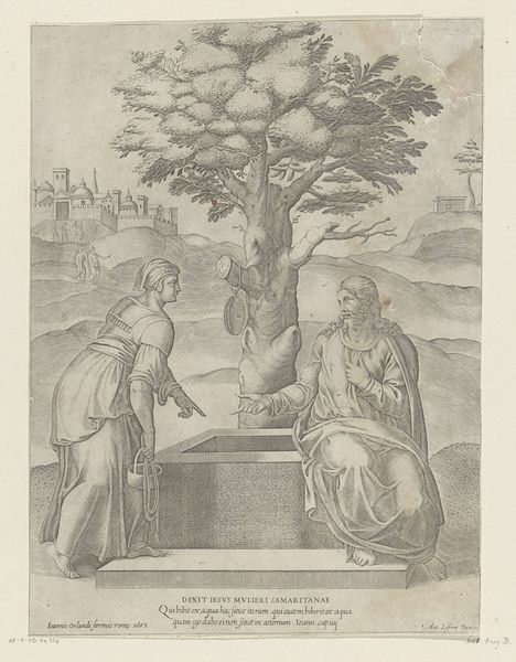 Editor: So this is "Christus en de Samaritaanse vrouw bij de put", or Christ and the Samaritan Woman at the Well, made sometime between 1525 and 1565. It’s currently held in the Rijksmuseum, and Nicolas Beatrizet is credited as the printmaker after a design by Michelangelo. It's an engraving. I’m really struck by how…detailed everything is, even though it’s a print. What are your initial thoughts on this work? Curator: This engraving highlights several key aspects of Renaissance material culture. Let's consider the socio-economic factors involved in its creation and consumption. Engravings like these weren't just about art; they were about disseminating ideas and religious narratives in a portable, reproducible format. The availability of paper, the skill of the engraver, and the printing press are crucial factors. How does the print's medium – the easily reproduced engraving – affect its original audience? Editor: That’s a great point. The accessibility is key. Were engravings like these intended for a wider audience than, say, painted panels or frescoes? Curator: Precisely. The print allowed the subject, from the Bible, to reach individuals who wouldn’t have necessarily been able to afford original paintings, such as merchants, craftsmen, and even lower-ranking clergy. The image could be shared and traded; we can look at the global impact as its meaning would diffuse outward, adapted, copied. What effect does that proliferation have? Editor: That makes a lot of sense. Considering that context really opens up a whole new perspective. Now that you mention its availability, how that alters its reception and function as a material object? Thank you! Curator: Certainly, paying attention to materials and methods allows us to consider the cultural meaning tied to its modes of production and the art itself, as material with potential impact..