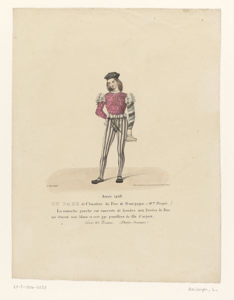 Curator: Look at this watercolor drawing, dating back to 1826, by Louis Boulanger. It's titled "Kostuum van een page van de Franse koning uit het drama Louis XI à Péronne," held in the Rijksmuseum's collection. Editor: It’s so striking, immediately whimsical yet also somber. I find the flat, bright colours coupled with the stark, minimalist background really compelling. Curator: Indeed. Notice how the Romantic style emphasizes the symbolic weight of clothing. What does this specific attire communicate about status and belonging in the French court of the era? Editor: Costume signifies a huge amount about status and craft—look closely at the meticulously rendered details, each signifying hours of labour for the theatre and the symbolic meaning of red in those striped stockings... We can appreciate the social relations required for such a theatrical production in 1826, not to mention the earlier drama's depiction of Louis XI. What did the costume represent for the Parisian theater audience in terms of royalty? Curator: It taps into both the glamor and restrictions of courtly life. The vibrant yellow suggests loyalty and pageantry, but the tightly fitted tunic and hat indicate servitude to power. Even the artist, Boulanger, hints at a dual relationship, depicting the freedom and bondage present within such service, playing out social and psychic dynamics. Editor: Right. I find myself dwelling on what looks like watercolour on paper. The cost involved would suggest who the target audiences were and the artist's intention in reproducing stagecraft on a readily reproducible medium. These vibrant reds and blues have weight; this isn’t simply decoration but communication and labour made visually arresting on stage. Curator: Precisely. The visual motifs carry symbolic meaning to influence those seeing this figure in costume—both at the theater then, and still to audiences today through reproductions such as this drawing, prompting an emotive and lasting recognition of power, of place, and even identity in this costume from French cultural memory. Editor: Reflecting on how costume is about labor as well as stage illusions opens interesting routes into considering not just theater production and the art world but the larger society surrounding these visual signs. Curator: Yes, an invitation into considering the echoes of past eras through very vivid aesthetic remnants.