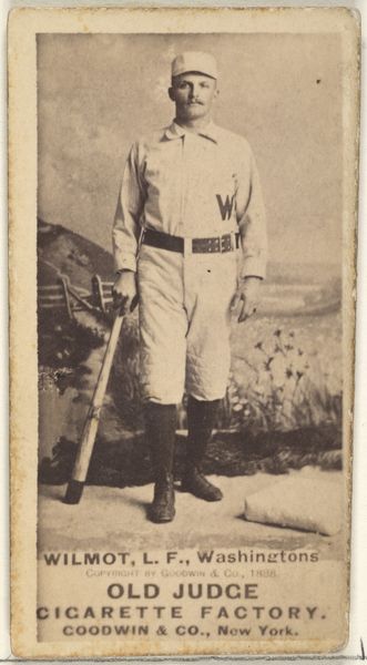 Editor: So, this albumen print from 1888 features George Edward "Ed" Andrews, a center fielder for Philadelphia. It’s part of the "Old Judge" series, used as cigarette cards, which is so interesting to me! It's quite formal, even serious, considering its purpose. What do you see in this piece? Curator: I see a carefully constructed image steeped in symbolism. The sepia tones lend an air of nostalgia, but consider the deeper connotations. Cigarettes represent adulthood and pleasure, juxtaposed with an athlete, symbolizing strength and health. It's a clever dance of opposing ideas to make smoking appealing, no? What message might that juxtaposition convey, do you think? Editor: Maybe that smoking won’t diminish your strength or athleticism? A false promise, clearly, but a compelling image at the time. And baseball itself would have carried a lot of cultural weight as a symbol of American identity. Curator: Exactly. Baseball’s rise coincided with a need for national unity post-Civil War. Placing Andrews, an idealized athlete, on a card associated with a ubiquitous habit anchors the sport within the everyday lives of people and contributes to cultural memory. Did you notice the background? It is artificially constructed! Editor: It looks more like a theatrical backdrop than a real baseball field, doesn't it? I suppose that adds to the sense of constructed image, rather than a spontaneous snapshot. Curator: Indeed. This theatricality reinforces how meticulously crafted the image and its associated message were for consumers at the time. These symbols combined to communicate an entire ethos around turn-of-the-century American life. Editor: That's fascinating; I hadn't thought about all the layers of meaning packed into such a small card. Curator: Examining images like these lets us see how values and aspirations were subtly promoted and perpetuated, using objects as commonplace as baseball cards.