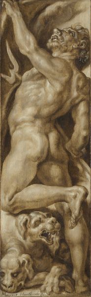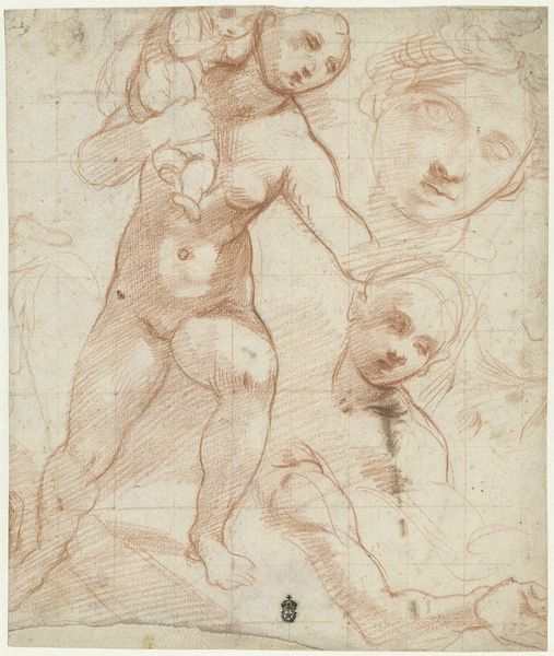 Curator: What immediately strikes me is the artist’s fascination with feet. They're monumental. Editor: That's perceptive. We are currently looking at "Copy After Michelangelo's Aurora" by Bartolomeo Passerotti, created around 1550, a work rendered with charcoal and perhaps oil pastel on toned paper. Curator: "Copy After..." implies layers of artistic intention. It becomes a commentary on legacy, on power structures inherent in artistic replication, doesn't it? The deliberate choice to copy already monumental work amplifies themes of influence. Editor: Exactly! The drawing captures a figure derived from Michelangelo's sculpture of Aurora on the Medici tombs, part of an elaborate dance between sleep and awakening. There are so many layers. Beyond a record, or practice, this image, with it’s somewhat academic assemblage, explores what is essentially an objectification of a representation of an idealized woman as allegorical figure, while those feet could be read to reference a classical antiquity, now through a contemporary gaze. Curator: I am caught by that sense of sleep. She is heavy, monumental but heavy and vulnerable, too. This rendering doesn't imbue her with divine authority, though perhaps in that earlier instantiation of the Aurora, that of Michelangelo, that association was clearer? But the iconology is almost beside the point. Editor: Agreed. The fragmented nature creates an entirely new symbol, something far more intimate than perhaps either originator imagined. It hints at the physical, labor that shaped the original work. Curator: I see it also as an embodiment of the complex relationship between male artists and their female subjects. How the body is perceived through the lenses of power and aesthetic tradition... It also subtly disrupts the viewer's own gaze. The feet, while detailed and magnificent, also serve as a kind of barrier. Editor: A re-negotiation, in a way. Passerotti isn't merely replicating; he's reinterpreting, filtering through his own context. Curator: An unfinished quality too! A process made plain, without the visual completion we perhaps expect. The copyist implicates the source while allowing, demanding we reassess its themes. Editor: In observing the copy, we see something original unfold. Curator: The layers add to the conversation, yes, each adding new, potent ingredients to an enduring narrative.