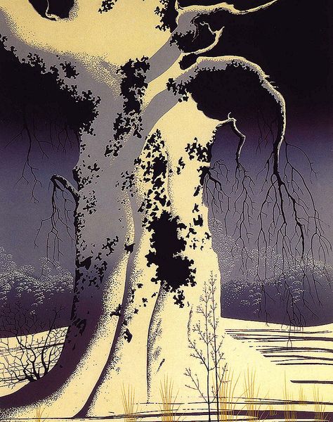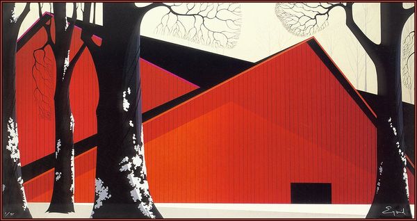 Eyvind Earle created "Ruby," an image dominated by flat planes of colour, sharp lines and a composition divided by the stark contrast between the red barn and the dark tree. These formal choices imbue the scene with a sense of graphic simplicity. The artist's aesthetic focuses on the abstract qualities of form and structure, simplifying nature into blocks of bold, saturated colours. The high contrast between the ruby red of the barn and the black tree covered in white snow creates a visual tension, a juxtaposition that invites viewers to see beyond the surface representation and to reflect upon the underlying formal elements. The image, devoid of atmospheric perspective or softening details, serves as a study in shapes and tones. The wood panels of the barn create a rhythmic, vertical pattern, disrupted by the organic form of the tree that bends and branches across the pictorial space. The composition, with its near-geometric shapes and careful colour choices, functions as a cultural sign, evoking a sense of stylized natural beauty. The artwork underscores how visual forms can create meaning and invite continual re-evaluation.