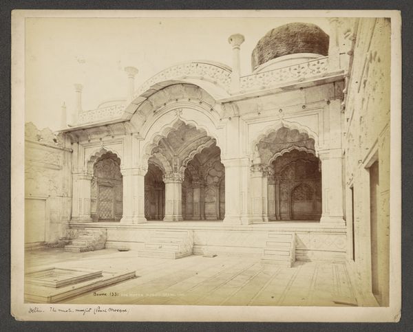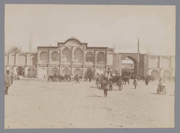 Editor: This photograph, "Tophane fontein in Istanboel" by Sébah & Joaillier, taken between 1888 and 1900, is a fascinating look into the past. It's a print, and the light is beautiful. I find the detail on the fountain itself really striking, but I'm curious, what catches your eye when you look at this? Curator: I am immediately drawn to the photograph's capacity to reveal the social context of its production. This wasn't simply about aesthetic representation, it’s about the studio of Sébah & Joaillier marketing an orientalized image to a Western audience. Notice how the architectural details of the fountain, though intricately crafted from stone, are flattened into a consumable image. Editor: Consumable image? Curator: Precisely. The photographic print, a mass-producible item, transformed this public work, the fountain itself, into a commodity. The clothing, too. And how is that consumption supported? We could consider the labor involved: from the photographers, to the printers, and even the local people who appear in the shot. How did their presence in the photograph impact the economics of representation at the time? Editor: That's a perspective I hadn't considered. I was mostly looking at the style and the... exoticism, I suppose. But you're right, the image itself is an object produced with labor and intent for specific markets. Curator: Think about the materiality of the print itself. It is not just an image, but an object made by a process of selection, exposure, development and printing. Each step shaped by human intervention and reflecting economic and cultural agendas. What stories about labour do the physical characteristics of the print -- the fading colours, the paper it's printed on -- whisper to you? Editor: This really highlights how looking at materials and processes can unlock so much about the context of a work! Thanks, this has definitely given me a richer appreciation.