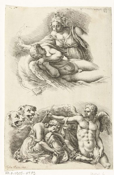 Editor: So, this is "Kennis van God brengt liefdadigheid voort" from 1550, an engraving by Dirck Volckertsz Coornhert, here at the Rijksmuseum. The figure, almost floating on the back of an eagle, seems both powerful and vulnerable. It’s… a bit unsettling, actually. What do you see in this piece? Curator: Ah, yes, unsettling! That's a good starting point. I always think Coornhert is trying to show us the raw, often contradictory, nature of virtue. Look at the burning heart she holds – passionate, almost violently so – against the ethereal, divine light in her other hand. The contrast gets to me. The engraving, all stark lines, just intensifies that duality, don’t you think? Editor: Definitely. The eagle too, so majestic but also… predatory. Is that intentional, that sense of opposing forces? Curator: I believe so. It is not about the figure but her balance. It's the dance, right? What if Divine Knowledge, that ethereal light, demands sacrifice? What if true Charity emerges only from a place of fiery, passionate commitment? It is an uncomfortable equation, but maybe that’s the point. Maybe Coornhert wants us to question our own easy definitions of goodness. Editor: It definitely makes you think beyond just a surface-level reading of “knowledge leading to charity.” There’s a real struggle implied there. Curator: Precisely! And isn’t that so much more human? Forget angels on clouds, Coornhert's giving us virtues grappling in the messy reality of the everyday. Editor: I'll definitely be seeing this in a new light now. Thanks! Curator: My pleasure! Perhaps art is meant to be embraced, a messy kind of love to the eyes.