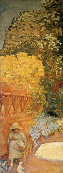 Pierre Bonnard painted this panel from the triptych *The Mediterranean* at the turn of the century, during a period when artists turned to domestic scenes. Here we see a woman and child sitting in contemplative repose. Bonnard often focused on intimate, personal moments. These scenes celebrated the female figure, capturing the essence of everyday life and a quiet, feminine experience. But there is a charged history to such images. In the context of early 20th-century France, the representation of women and children often carried undercurrents of social expectations. While seemingly a serene snapshot, it also subtly reflects societal norms and the expected roles of women in domestic settings. Bonnard offers a glimpse into the interior lives of his subjects, inviting us to consider the personal within the public sphere. It encourages us to reflect on the complex interplay between identity, environment, and the gaze of the artist.