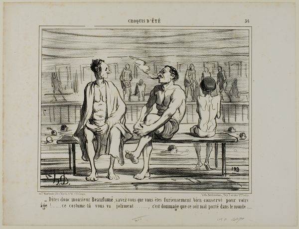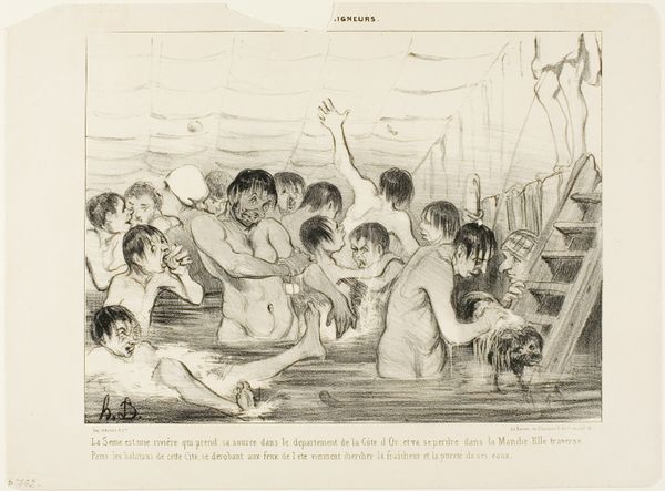 Honoré Daumier sketched this lithograph titled “Croquis D'été” in the 19th century, capturing a scene at a public bath. The bath itself is a potent symbol, historically viewed as a place of purification and communal gathering, but here, it is tinged with irony. Note the varied body types and expressions – some figures plunge into the water with abandon, while others converse with skepticism. This contrast echoes the ancient motif of the 'divided self', mirroring internal conflicts and societal contradictions. The bath, once a site of ritual cleansing, now becomes a stage for social commentary, reminding us of the cyclical nature of symbols: how they resurface, evolve, and take on new meanings in different epochs. The emotional weight lies in Daumier’s subtle critique, inviting us to reflect on the ever-changing rituals of society and the perennial human struggle with vanity.