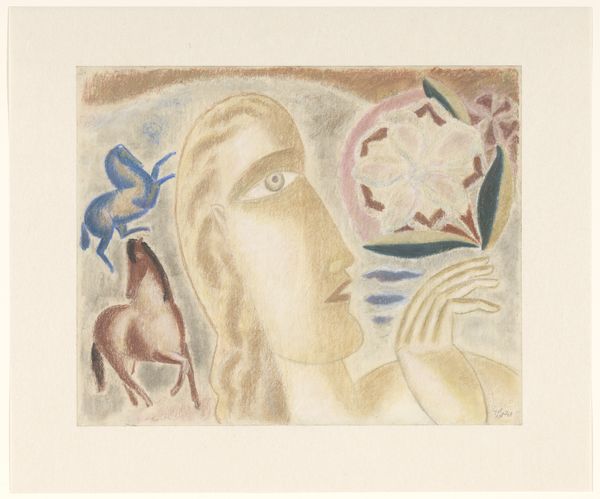 This is Jan Toorop’s drawing 'Vrouwenkop met rossig haar en Chrysant' at the Rijksmuseum. Notice the delicate network of lines that define the woman's face and the flowing, almost ethereal quality of her hair. The drawing is framed by a barely-there border, emphasizing the flatness of the picture plane. The chrysanthemum, centrally placed, draws your eye with its radiant geometry. Toorop challenges traditional portraiture. He integrates the figure with the botanical, blurring the lines between human and nature. The pale colors and the fine, almost invisible hatching create a dreamlike atmosphere. This piece destabilizes the typical symbolic use of flowers. Instead, Toorop seems to engage with a formal exploration of line, color, and composition. The overall effect is of a carefully constructed harmony. This hints at a larger discourse concerning the subjective experience and the structural underpinnings of aesthetic representation. The artwork invites us to reconsider the boundaries between observation and interpretation.