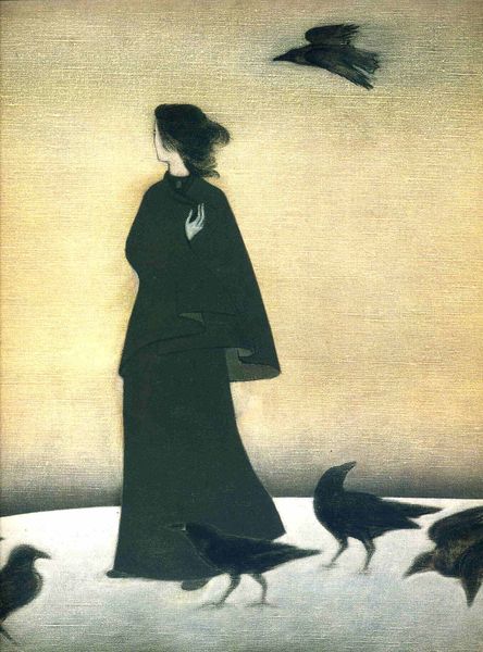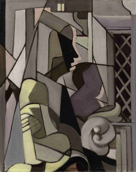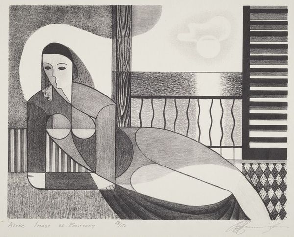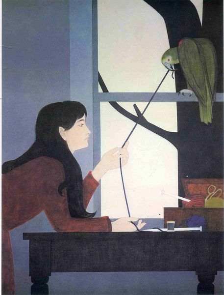 Curator: Welcome. We're standing before Will Barnet's enigmatic piece titled "Introspection." Barnet primarily worked with tempera and is considered part of the Modernist art movement. What's your immediate take? Editor: Wow, there's a still quietness in it that feels almost…melancholic, but beautiful. All those grays and blues are gorgeous together. She could be any of us when we lose ourselves reading, don't you think? Curator: Absolutely, the muted color palette certainly establishes a subdued mood. But consider the historical context—the pervasive anxiety during the Cold War era might reflect some fear of missing out (FOMO), adding layers to her introspection. I also find the presence of these paired birds above the girl evocative. Editor: FOMO back then? Hmm, maybe. I'm seeing hope, honestly. To me those two doves outside of the window just scream promise! A life of freedom ahead of her even? Who knows. It’s interesting. I didn’t pick up the political aspect initially. It makes me reconsider my perception of her sadness! What about you? Do you think the geometric shapes add another layer of separation for her? Curator: Indeed. Geometric shapes give a structure here, it is about an enclosed life of knowledge, right? One also need to see the visual representation of woman's constraint on free speech as if being in closed place. Also, one needs to explore whether such positioning promotes stereotypical expectation, the place for woman in society back then and still? Editor: Hmmm! Yeah, and there’s also something about that apple. Almost biblical but she is almost rejecting its value. Fascinating! I wonder how Barnet perceived this woman’s power, reading to become more than perhaps those two birds are capable of seeing on their tree branch. Curator: Precisely. These elements open a discourse about the constraints and possibilities women face in society at that time, inviting critical discussions about agency, patriarchal norms, and gender performance in art. I appreciate that. Editor: Well, that just changed how I’ll see this work from now on! Curator: Which I hope has enriched our understanding and personal engagement with "Introspection". Thank you for exploring these interpretations.