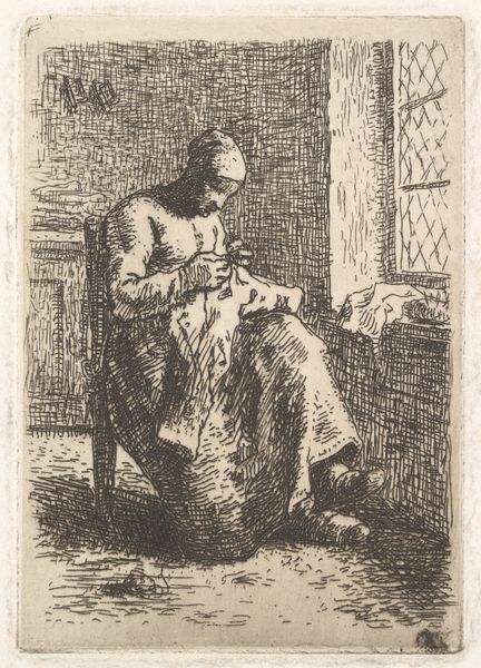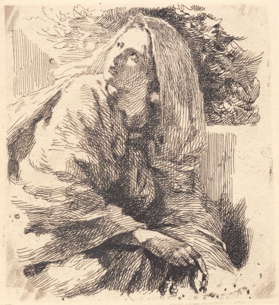 Curator: What a melancholy mood emanating from this print. Editor: Indeed. We're looking at a work entitled "Seated Arab" by Mariano Fortuny Marsal. It is an etching, a type of printmaking that lends itself particularly well to detailed line work and tonal gradations like we see here. Curator: The contrast is quite stark, isn't it? The figure is so enveloped by shadow that their form feels almost spectral, a being fading into the very texture of the background. There's a sense of confinement here, both physical and perhaps psychological, as the subject seems huddled against the wall, almost shrinking in size. Editor: It is an interesting study in the representation of Orientalism and its social underpinnings. We should remember that Fortuny, during his travels and work in North Africa, would have portrayed not just the landscapes and the daily life of the region, but he also engaged with European artistic tropes which constructed views of the "Orient." How does that interplay of observation and expectation impact our reception? Curator: A valid and crucial point to consider. The formal qualities of the etching technique itself certainly feed into those notions of Orientalism. The rough lines, the use of darkness... do they convey a romantic idea or some objective realism? It's something to consider whether those aspects reinforce stereotypes. The composition creates a somber atmosphere for the viewer. Is this empathy, or is it exoticization? Editor: Absolutely. And what does it say about the artist's position of power when selecting this moment to etch? How complicit were European artists in creating enduring visual and cultural narratives? This invites us to look closer at the political discourse in Europe at the time and the imagery it created. Curator: Thank you. Reflecting upon the European perspective makes it difficult to view only the expressive rendering and somber pose that evoke complex themes relating to identity and cultural representation. Editor: Indeed. Seeing it this way enriches the artwork's complexity for future audiences to learn more.