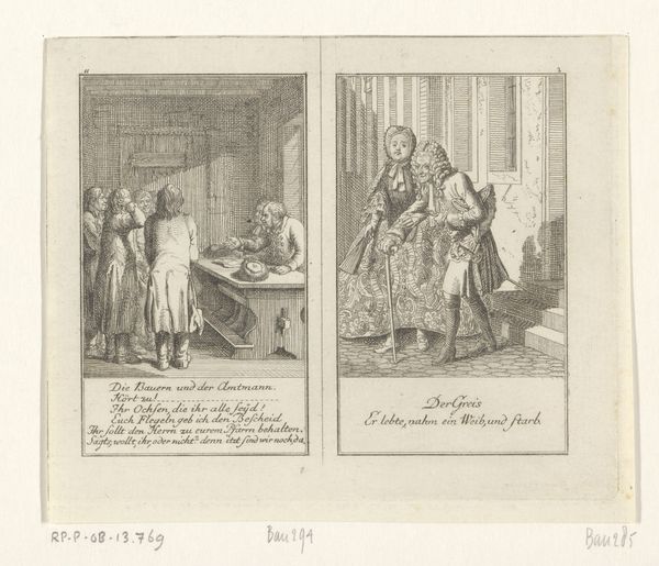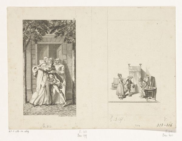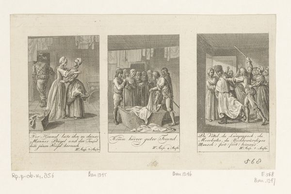 Daniel Nikolaus Chodowiecki created this print, titled "Drie voorstellingen uit de Brandenburgse geschiedenis," which translates to "Three Scenes from Brandenburg History." This work provides insight into the social and political dynamics of 18th-century Brandenburg. Chodowiecki, living through the Enlightenment, presents scenes that touch on power, succession, and familial relations. Looking closely, we see the ways in which gender and class are performed and negotiated. Each scene offers a glimpse into pivotal moments, framed by the conventions of the time. The artist seems to be asking: How do these historical moments shape the identity of a nation? How do the personal dramas of the royal family become entwined with the fate of the state? It leaves us to consider how these representations uphold or challenge the status quo. Ultimately, Chodowiecki's work invites us to reflect on the weight of history and its impact on our present. It’s a reminder that the stories we tell about the past are never neutral; they reflect our current values and shape our collective identity.