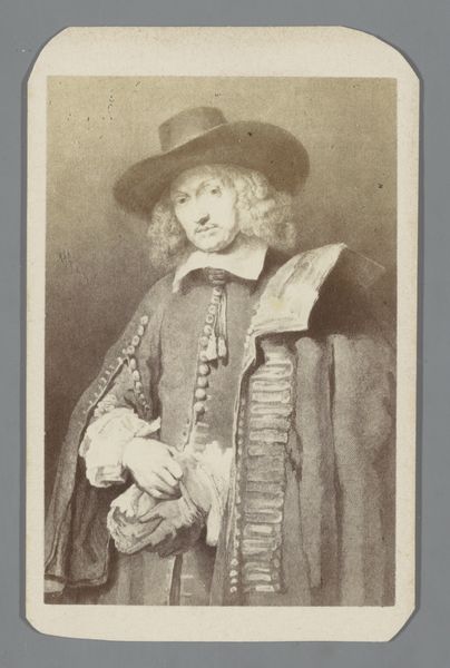 Curator: It’s hard to ignore the immediate sense of melancholy in this image, wouldn't you agree? The subdued lighting and the sitter's somewhat downcast gaze certainly contribute to that feeling. Editor: Absolutely. "Portret van Jan Six," rendered as an etching sometime between 1823 and 1853 by Johann Wilhelm Kaiser, uses shadow so effectively to create that mood. I think what you are picking up on as melancholy is partly the social conventions around portraiture at the time, and partially its function to idealize Six in representation, for posterity. Curator: Conventions are vital of course. The wide-brimmed hat and elaborate cape are clear signifiers of status. The cape itself almost engulfs the figure, acting as a visual representation of Jan Six's public persona, but then you notice how delicately he’s holding what appears to be gloves. A softer more subtle sign. Editor: Exactly. Kaiser created this image of Jan Six posthumously; he was long gone when the etching was completed, so he may have also wanted to portray this public man, someone influential in the Golden Age, as accessible. Kaiser worked, after all, to establish museums in Amsterdam. Curator: The gloves, the soft curl of his hair, all humanize him and perhaps speak to something beyond his influence. Look closer and there are countless fine lines suggesting both his wealth but also inner thoughts and fleeting expression. Editor: Indeed, those minute details pull the viewer in. It makes one consider the role this type of academic art played, especially at that moment. Etchings such as this spread the image and fame of elite individuals and cultural heroes among the growing middle classes and, because it hangs here in the Rijksmuseum, its cultural role perpetuates. Curator: Museums give them a stage but artworks like this carry complex codes embedded with cultural and personal meaning, almost frozen in time but waiting to be unlocked by each new viewer. Editor: Yes, and even in reproductive media, those complex meanings reflect not just the sitter, but the time it was made in, and how institutions reflect on history today.