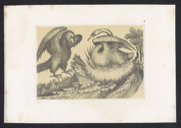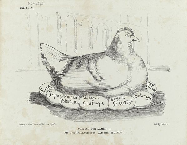 Curator: This piece, "Spotprent op Thorbecke, 1872," by Johan Michaël Schmidt Crans, executed in pen, drawing, and print, presents a compelling visual argument. What strikes you first? Editor: Well, I'm immediately drawn to the sort of dejected-looking chicken with a man's head surrounded by eggs labeled with things like "taxes" and "defense." It seems quite critical, but I’m unsure of what to make of it. How do you interpret this work through a materialist lens? Curator: Notice the lithographic print, one of many made for mass consumption, a deliberately cheap and accessible medium. This very accessibility allows the artist to circulate this political critique widely. It reduces Thorbecke's stature, associating him with something as ordinary as a chicken. These aren't just any eggs; they're inscribed with socio-political issues that touch every class. "Higher Education," "Taxes" — what are these commonplace yet critical components of this society actually worth, based on this medium's rendering of events? Editor: So, the act of mass-producing and circulating these critical depictions, turning political figures into farm animals and national issues into flawed eggs, that’s the art? Is the cheapness of the reproduction crucial? Curator: Precisely. Consider the economic and social capital necessary for art to thrive. The 'cheapness', as you put it, directly challenges the concept of art being confined to elite patrons and institutions. What is Schmidt Crans suggesting about these issues being left ‘laid’ by this…chicken-man? Is he mocking these proposed resolutions, or simply saying the eggs were never properly hatched? Editor: I see what you mean! By utilizing readily available printing technology, he transforms socio-political issues, once untouchable, into common "knowledge", something the public is meant to confront, question, and dissect together. So much to mull over; thank you! Curator: Indeed. This cartoon challenges us to think critically about the relationship between political power, artistic production, and public consumption, and ultimately—to evaluate how each citizen internalizes the effects of that cultural landscape.