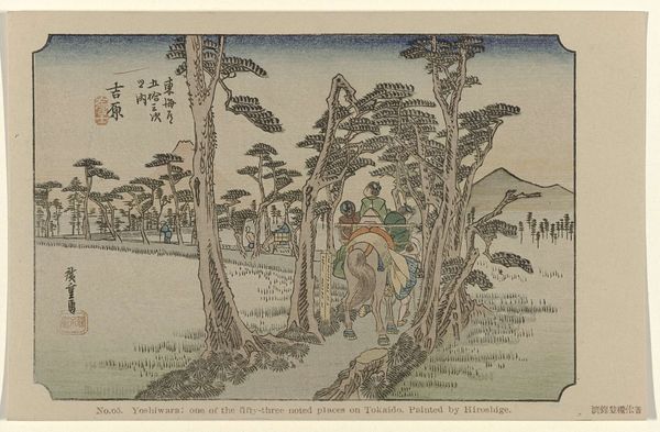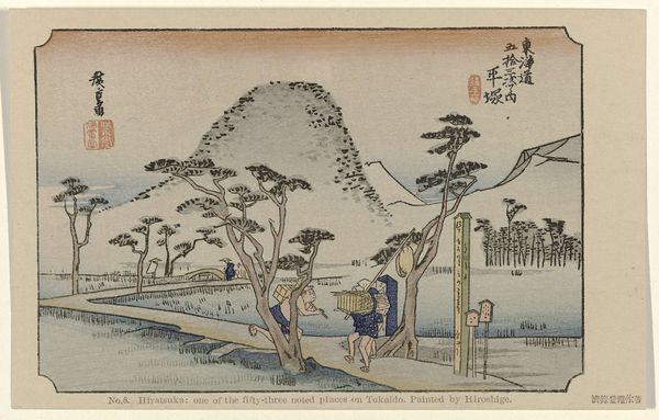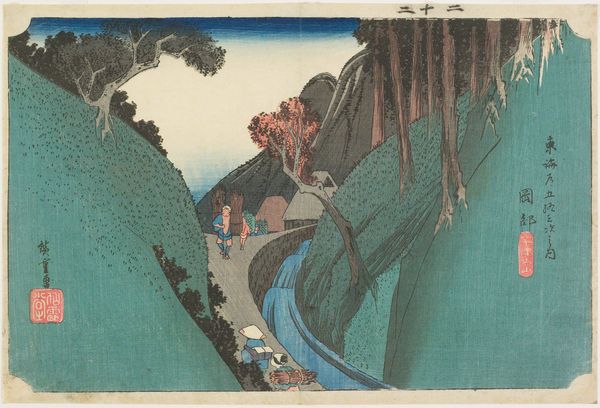 This woodblock print, created by Utagawa Hiroshige, captures a scene from the Tōkaidō road, focusing on the Okabe station. The landscape, with its towering trees, winding path, and travelers, is rich with symbolism. Water is a dominant motif, depicted as a stream flowing vigorously downhill. Water, especially in Eastern traditions, is a symbol of purity, renewal, and the transient nature of life. We can trace the flow of water as a powerful symbol of cleansing and rebirth, such as baptism. The inclusion of the waterfall emphasizes the never-ending cycle of life, death, and rebirth, and represents the passage of time. The travelers, dwarfed by nature, highlight humanity's relationship with the natural world. This evokes a deep emotional response, reminding us of our own journey through life. The image's enduring appeal lies in its cyclical themes, which have been reinterpreted across time.