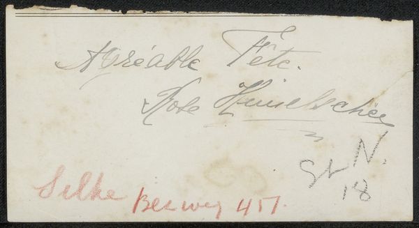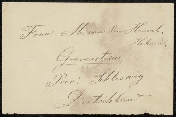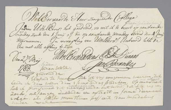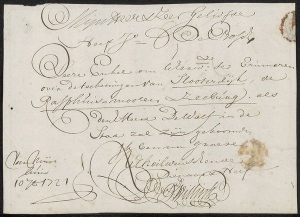 Curator: Oh, I find this rather intimate. It is titled "Brief aan anoniem" which translates to “Letter to Anonymous." We think it's from around 1780, maybe '81. F.J. de Larrey created it, a pen and ink drawing on paper. What strikes you first? Editor: The vulnerability. It whispers of secrecy and fragile hopes, don't you think? I feel like an interloper peering into a private exchange, something delicate poised on the cusp of exposure. The faded paper adds to this mood of fleeting intimacy, a sense that these thoughts, rendered so carefully, are on the verge of disappearing. Curator: Exactly! The calligraphy is remarkable, isn't it? It's like a visual echo of Romanticism, where emotional intensity took precedence. It's as if the words are drawn rather than written, capturing feeling through script. Editor: Definitely! Look at the elegant swirls, the pronounced downstrokes that highlight significant words like "Hoogheid"– Highness– adding visual emphasis and establishing the rank of the receiver! We immediately get this tension between the known and the anonymous. Curator: Indeed. Consider that paper too. The discolorations speak volumes. You can almost sense the age and handling of the physical artifact that lends a peculiar aura of lived experience. This is history you can touch and feel, which renders "Brief aan anoniem" extremely powerful and engaging. It invites a unique level of connection with a specific yet ambiguous, moment of the past. Editor: Yes, and even that signature, F.J. de Larrey, feels like a carefully constructed symbol rather than a mere identification. It’s got this very Baroque flourish that speaks to status. Curator: To sum it up, for me, "Brief aan anoniem" it is a small portal into the complex, emotionally charged world of the late 18th century. Editor: It's as though it pulls us closer to lost stories and concealed connections; I could get completely lost exploring all of this symbolic imagery...