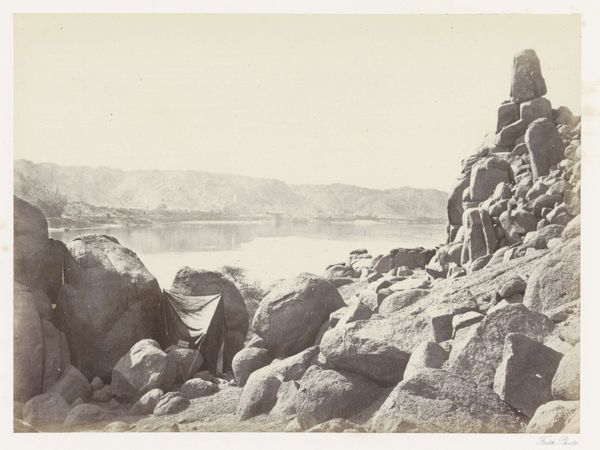 Curator: We’re looking at Francis Frith’s photograph, "The Approach to Philae," created around 1857 using the gelatin-silver print process. Editor: My first thought? That incredible, textured foreground! Those huge rocks, worn smooth by time, make the temples on the island seem so distant, almost like a mirage. Curator: Indeed, Frith’s image creates a layered experience. Philae, of course, was a sacred island, central to the cult of Isis. It became a major pilgrimage site in the ancient world, carrying huge symbolic weight for centuries. Editor: I’m fascinated by the material reality here. Think about the logistics: hauling heavy photographic equipment to Egypt in the mid-19th century. What an endeavor! The tones are soft, the silver gleams. It’s almost painterly. Curator: The softness serves to enhance the spiritual essence of the place, that liminality between the mortal realm and the divine, something intrinsically communicated in Egyptian symbology. That sacred island… it vibrates with the energy of belief. Editor: Absolutely, and this photograph becomes part of that history. Frith wasn't just recording a place, he was participating in the evolving Western gaze upon it. It makes me wonder about the laborers involved. Who developed these prints? Where were the silver mines that created the media? Curator: We can interpret these stones in the foreground as representative of primordial creation – that substance predating history and humanity from which such complex monuments emerge as naturally as these geologic formations, but they still seem to be set in that historical stage. The river as a mirror, the solidness of ancient memory. Editor: You’re right. Thinking about materiality makes me more grounded. How was this image circulated? Who could afford such a print? This connects directly to patterns of wealth and influence even today. Curator: And ultimately, images like these carry on the echoes of the past to reverberate within us. Editor: The production gives it more than visual connection but tactile. Something present that transcends history. Curator: Precisely, from the human hand, to human eyes and spirit, thank you!
