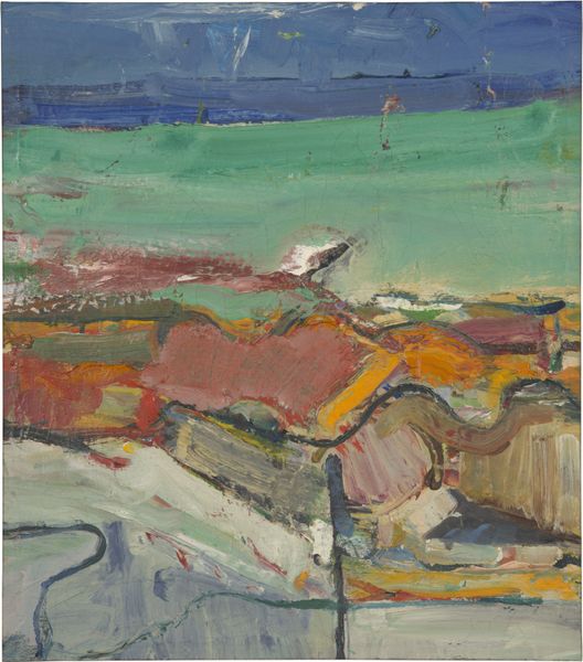 Curator: Welcome! Today, we’re looking at "Working the Field" by Constant Permeke. It's an oil painting, executed with impasto and in plein-air style, typical of his expressionistic landscapes. Editor: It's... brooding. Those heavy, earthy colours—greens, reds, and browns—create a palpable sense of weight. And the thick impasto makes everything feel so dense and tangible. It almost feels oppressive, really. Curator: Precisely. The density underscores Permeke's stylistic focus: an emphasis on materiality and formal construction. Note the flattened perspective and simplified forms; the cottages, hills, and sky are all reduced to fundamental geometric shapes. Observe, too, the lack of detailing. Editor: The absence of detail only amplifies its intensity. This landscape isn't just a visual scene, it’s a depiction of manual labour, which permeates throughout the visual narrative. How do you think Permeke's own socioeconomic background may have contributed to his perspective of rural life and labor? Curator: Ah, that reading falls beyond purely aesthetic concerns. Though I agree we see an idealisation of form. These weighty, monolithic blocks of color construct a self-contained reality rooted not so much in an authentic landscape experience, but in the purely material qualities of the medium. Editor: Yet the social and historical context informs that materiality. The brushstrokes themselves, laid down so heavily, can be interpreted as embodying the weight and strenuousness of manual labour. The dark colour palette feels almost claustrophobic, representing the limited opportunities and hardships faced by rural workers. Curator: True, and perhaps Permeke’s aesthetic rendering translates to broader symbolic interpretations – about mankind and nature for example. What remains fascinating to me, however, is how that vision of "Working the Field" creates this powerfully affective visual experience through fundamentally artistic choices of form, color, and application. Editor: And ultimately, understanding both allows for a more meaningful encounter with the artwork. Curator: Precisely! I'm glad we could reflect on both the construction and potential interpretation of Permeke’s ‘Working the Field’ here today. Editor: Absolutely! Hopefully, we’ve helped illuminate how those contextual influences resonate in art and create opportunities for cultural reflection.