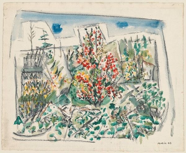 Curator: So much blue, almost hypnotic, isn’t it? A wistful kind of place. Editor: That's Henri-Edmond Cross's "Garden of the Painter at Saint-Clair," painted in 1908, which currently lives here at the Met. It's a watercolor capturing his garden at Saint-Clair, near the Mediterranean. Curator: The garden practically vibrates. But those lawn chairs— they seem lonely somehow. An absence, maybe? Or perhaps a hopeful anticipation? Editor: It's all symbols; the garden as paradise, cultivated and enjoyed but always reminding us of nature's raw power. It mirrors the Post-Impressionists wrestling with fleeting moments, trying to capture and preserve their experience of natural splendor. And then, the garden is always this loaded space—Eden, the locus of innocence and potential transgression. The colors mirror this dual sensibility. Curator: Transgression? From watering the flowers too much? Just kidding. Though, it really does evoke a kind of contained wildness, like a curated explosion. That color palette—unexpected, and yes, evocative, like the dream of a garden rather than a literal representation. I get a sense of immense heat tempered with something…poignant. Like the end of a long, lovely summer day. Editor: Think about gardens as places of the goddess, places where a ritualized vision of feminine potential, creation, birth and the seasonal, even circular elements are contained. The table implies a social act. He sets the stage with these powerful cues, with potent color psychology for an idyllic interlude, or is it an interruption to the everyday? And it’s an interior place rendered in the impressionist open-air plein-air tradition, blurring a binary opposition. Curator: Hah! Perhaps that's it, this tension that keeps my eyes glued to the watercolor; that subtle war between the garden as a symbol, and its joyful expression on the most superficial plane! The magic here hides in that lovely, unstable equation! I feel invited to pull up a chair. Editor: A final dance before winter, a nod toward all things fecund and transient, a moment made eternal, at least here in the galleries of the Met.