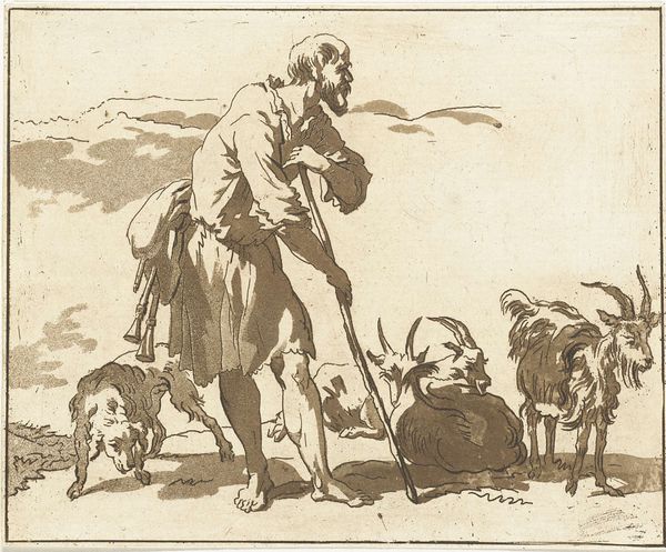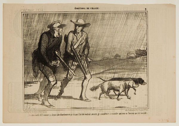 This drawing by Honoré Daumier presents a scene of dejected hunters caught in a downpour, rendered with expressive lines and subtle tonal variations. The composition, dominated by the vertical strokes suggesting rain, evokes a sense of gloom and futility. Daumier masterfully uses line to convey not just the physical discomfort of the rain but also the emotional state of the figures. Notice how the lines are not uniform but vary in thickness and density, creating a dynamic texture that adds depth to the scene. The hunched postures of the men, their faces etched with weariness, are conveyed through precise contours and shading. Even the dogs seem to share the somber mood, their forms merging with the landscape through Daumier's skilled manipulation of light and shadow. In essence, the drawing functions as a commentary on human experience, using the visual language of form and line to explore themes of disillusionment and the absurdity of human endeavors. The scene is a testament to Daumier's ability to transform everyday observations into profound statements about the human condition.