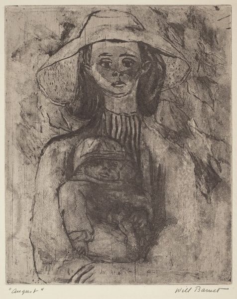 Curator: There's such a potent stillness emanating from this work, a spiritual solemnity rendered in muted browns. Editor: Indeed. What we're looking at is "Hail Mary," a drawing by Paul Gauguin, created somewhere between 1893 and 1895. He employed charcoal, pastel, pencil, and ink on paper, achieving a remarkable depth with such understated media. Curator: That choice of medium is striking; it lends a rawness and immediacy, contrasting the iconic subject matter with a palpable earthiness. There’s an almost tangible cultural tension between the overt religious iconography and Gauguin's depiction of Polynesian figures. Do you see it the same way? Editor: Absolutely. It’s hard not to interpret Gauguin’s visual choices here through the lens of colonialism and exoticism which pervade his other works from this period. The "native" Madonna, overlaid on a deeply Christian scene—it reflects a specific political milieu and Gauguin's unique, sometimes problematic, role within it. How much do you read that clash intentionally, versus Gauguin perhaps romanticizing what he encountered in Tahiti? Curator: I believe there's intent—he was fascinated by syncretism, the blending of beliefs. Those kneeling figures in the background, rendered almost spectral, hint at a wider tapestry of cultural integration, whether real or imagined through his European perspective. And consider the title itself; it positions this distinctly Tahitian scene within a globally recognized spiritual narrative. Editor: The politics of such representation are inescapable. How do we reconcile his personal quest for the "primitive" with the societal impact of exoticizing another culture, even in the context of religious devotion? Curator: It's a complex entanglement. What endures for me is the arresting psychological weight of that central figure. Regardless of the political backdrop, that mother and child convey universal themes of nurturing, protection, and quiet strength. Editor: Agreed. It invites us to reflect not only on art history and Gauguin's particular choices, but on our contemporary relationship to these complex narratives, their beauty and their inherent power dynamics. Curator: A challenging and ultimately rewarding piece that transcends simple categories. Editor: Precisely, a layered work with questions still lingering after over a century of contemplation.
