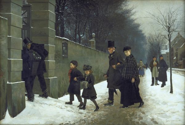 Editor: This painting, titled "Did they teach you that in school," created in 1953 by Grigor Khanjyan, is quite intriguing. Rendered in oil paint, it depicts a group of children in a snowy landscape, possibly a schoolyard. I’m curious about what draws your eye as a formalist expert. What do you see in this piece? Curator: The interplay of color and form commands my immediate attention. Observe the subtle tonal gradations of the snow, a masterful exercise in value, juxtaposed against the vibrant pops of red and blue in the children's clothing. How do these juxtapositions structure the composition? Editor: Well, the contrast definitely makes the children stand out against the muted background. I hadn’t thought about it so much in terms of formal arrangement before, though. Curator: Precisely. Now consider the use of line and perspective. Notice how the lines of the buildings in the background recede into the distance, creating a sense of depth, yet they remain subordinate to the figures in the foreground. Can you see how that formal choice shapes our perception of the scene? Editor: Yes, the foreground feels much more present and tangible compared to the background which seems to blur and fade a bit. Are you suggesting this highlights the children as the core element? Curator: It reinforces the immediate experience over contextual setting. The painting isn't trying to show you the entire town. Consider the materiality of the oil paint itself. Note the visible brushstrokes and how the impasto in certain areas adds texture and dimension, enhancing the tangibility of the scene. What does the artist seem to emphasize? Editor: The roughness gives it all a more ‘real’ feel. The kids are immediate and physical and the environment is secondary. Curator: Indeed. It prompts questions about how an emphasis on surface manipulation impacts meaning. Editor: That's really helpful! Looking at it now, I see how all the elements, line, color, texture, work together to construct the image in a way I didn't fully grasp at first. Thank you.