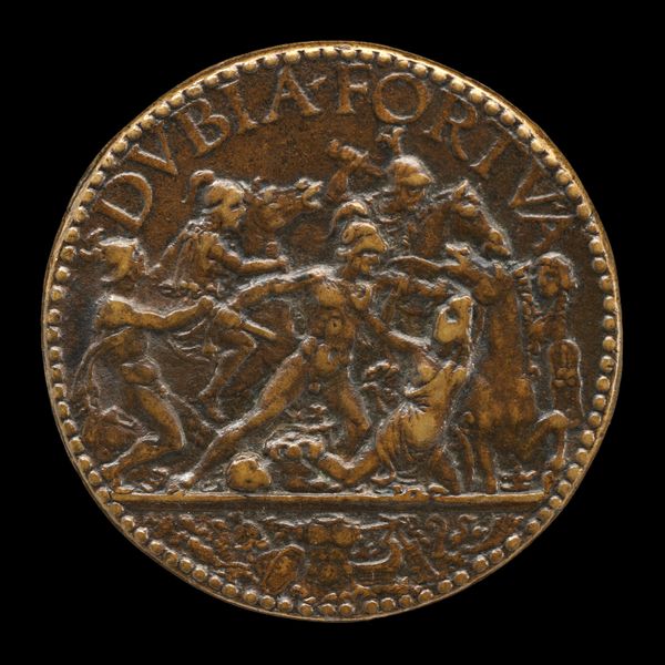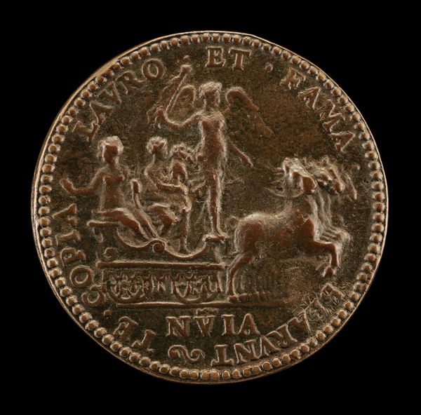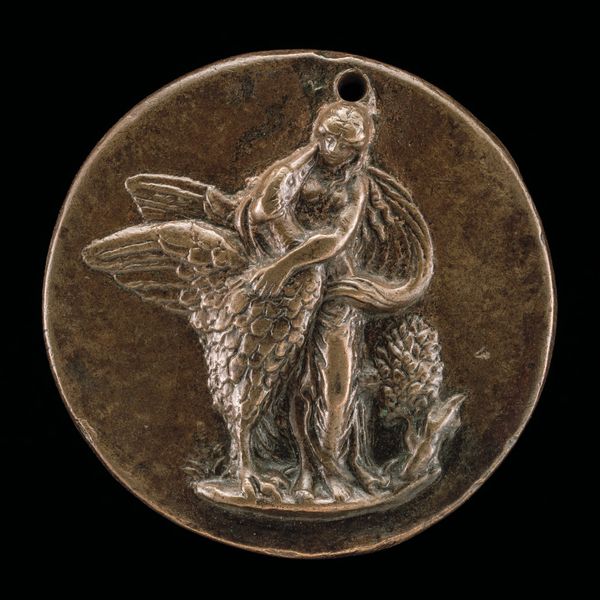This bronze medal, depicting a winged genius writing on a shield, was created by Giovanni Maria Pomedelli sometime before 1537. Bronze medals like this were not made with traditional sculpting methods, but rather cast using molds. The artist would have carved a positive image in wax or clay, then made a negative mold from that. Molten bronze was poured in, and once cooled, the mold was broken to reveal the finished medal. The choice of bronze itself is significant. It’s a durable material, yet relatively inexpensive, and its warm color lends the medal a sense of antiquity. The process of casting allows for the reproduction of intricate details, like the feathers of the genius' wings, and the lettering around the edge. In Renaissance Italy, medals like these were often commissioned to commemorate individuals or events. The amount of work involved – from design to casting and finishing – highlights the skilled labor required to produce them. These medals were objects of both artistic and social value, blurring the lines between fine art, craft, and currency.