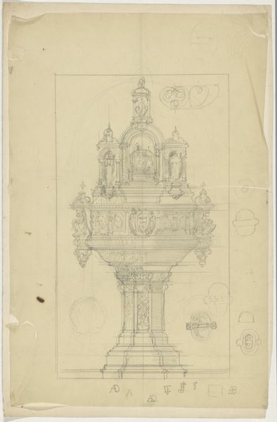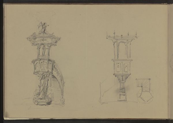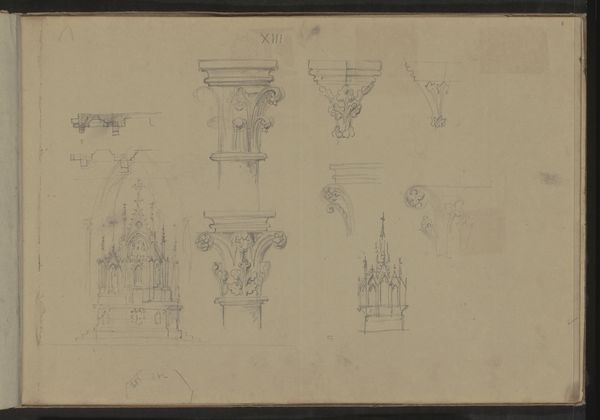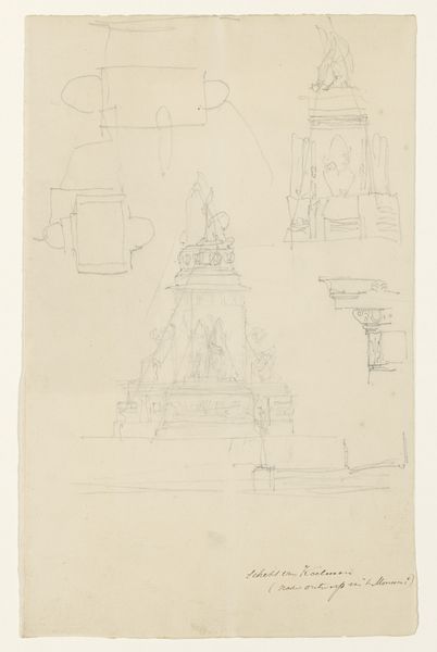 Curator: Let's take a look at this intriguing sketch page by Johan Philip Koelman, titled "Schetsblad met ontwerpen voor het monument voor Bernhard, hertog van Saksen-Weimar, op het Huygensplein Den Haag," dating from between 1828 and 1893. Editor: My initial impression is one of unrealized grandeur. A series of monuments, each unique yet sharing this yearning for permanence, sketched with such delicate impermanence in pencil on paper. It’s like a ghostly chorus of architectural possibilities. Curator: Indeed. We see Koelman, working within the Neoclassical tradition, grappling with the very idea of commemoration and public memory. Think about the social and political forces driving the desire to monumentalize Duke Bernhard in The Hague. He played a prominent role in the Dutch army. How do we translate that complex legacy into stone and bronze? Editor: Exactly! And the sketches vary wildly! Some are these stern, vertical obelisks demanding respect, others are almost playful, incorporating sculptures and ornate details, softening the message, I imagine. It's fascinating to see him working through different visual arguments. One design is graced by what looks like a rather comfy looking lion. Curator: Note the recurring motifs of figures—both human and animal. How Koelman is envisioning civic virtue and leadership. Considering shifts in the concept of heroism during that time, and how the public would engage with the imagery, provides useful background when interpreting these monuments. Editor: And they all speak to the relationship between landscape and the monumental...each framed by imaginary cityscapes...it's as if he's imagining how the light would catch each design, the shadow it might cast. This almost ghostly preview offers a powerful insight into an artist's creative mind at work. Curator: Thinking about the social history here is essential, I agree. Who was this monument ultimately intended to serve? Whose narrative was it solidifying, and perhaps more subtly, whose was it obscuring? Editor: It certainly provides some profound points to ponder! Ultimately this glimpse into a collection of dreams, the many that could have been made physical for posterity is quite moving!