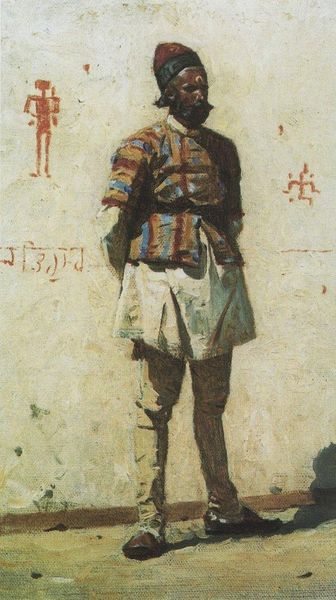 Henryk Rodakowski rendered "Ukrainian" in watercolor, its date currently undetermined. The painting compels with its earthy tones and textured brushwork. The figure's attire, rendered in layered browns and blacks, contrasts sharply with the white of his undergarment. This contrast focuses the viewer's attention on the figure's sturdy build, emphasized by the somewhat loose brushstrokes. Rodakowski uses a full, knee-down composition to explore themes of identity and cultural representation. Looking at the artwork through a semiotic lens, we see that the fur-lined coat, the simple walking stick, and the traditional hat each function as signs, embedding the man in a specific cultural context. These symbolic markers point not just to an individual, but to a collective identity. The very looseness of the brushstrokes suggests an interest in conveying essence over exacting detail. The overall effect invites the viewer to contemplate how personal identity is inextricably linked with broader cultural narratives.