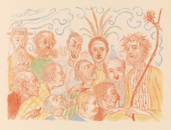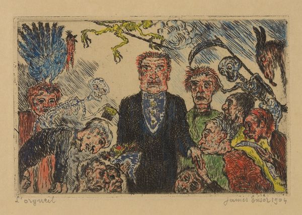 This is James Ensor’s print, *Envy,* and looking at the marks, it feels like he probably made it using etching and drypoint. The lines are scrubby and scratchy, and there's this whole swarm of grotesque figures crowding around a central couple with a baby, their faces a riot of disapproval. The whole thing kind of vibrates with a weird, unsettling energy. It's like a scene from a nightmare, where everyone's judging you. I love how Ensor creates depth and texture through the density of his linework. Look at the way he renders the faces, each line digging into the surface of the plate, leaving a mark that's both delicate and raw. The colour is built up through many layers, with these unexpected, lurid pops of yellow and red. The whole thing looks like it’s been dug up from somewhere, like a buried memory, or a half-remembered bad dream. It reminds me of Otto Dix, the way he used the language of caricature to expose the dark underbelly of society. For Ensor, as for Dix, art is not just about beauty, but about confronting the messy, uncomfortable truths of human experience.