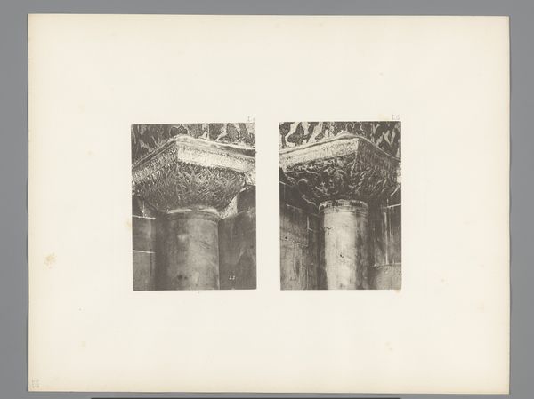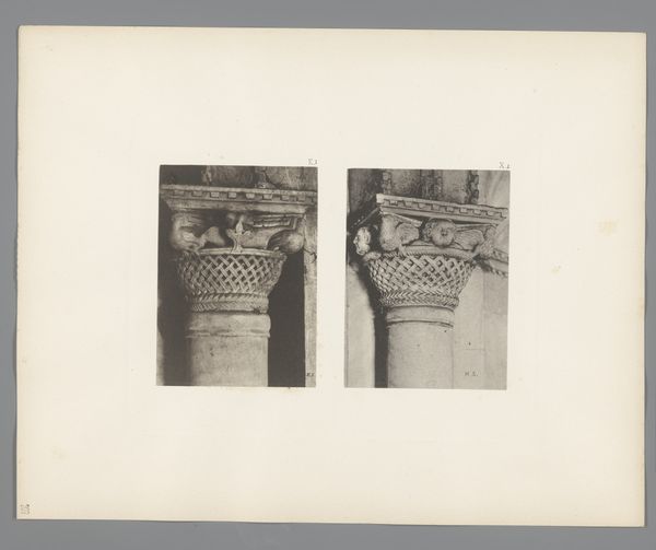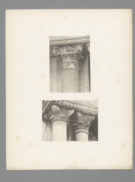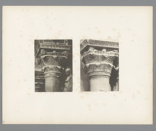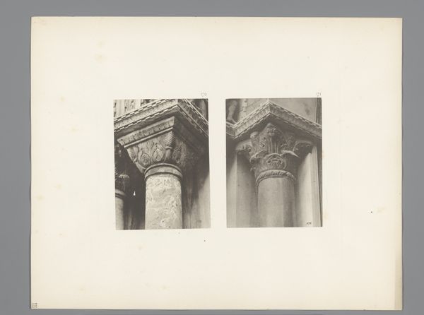 Curator: Well, hello there! Look at this, "Twee afbeeldingen van Korinthische kapitelen van de San Marco in Venetië" – two images of Corinthian capitals from St. Mark's in Venice. It was created before 1884 by Carl Heinrich Jacobi, a glimpse of architectural grandeur caught in time. Editor: Wow, a whispered echo of power, wouldn't you say? Seeing these columns...it makes me think of frozen music. They exude this aged grace, almost like silent sentinels holding onto a forgotten empire. Curator: Exactly! It's about the symbolism. These Corinthian capitals, so ornate, became powerful symbols in art and architecture, communicating authority and refinement. Consider how Venice used architecture to project its power! Editor: The level of detail! Those leaves—acanthus, right?—feel so meticulously rendered. It speaks volumes about the artistry that went into creating the original capitals, and Jacobi’s documentation of them. Is it merely a photograph, though, or some kind of print? Curator: It's an early photograph, hand-printed. You can see the texture of the paper – homemade even. Its aged look actually enhances the piece. Look at how the light touches the carvings. I find myself wondering if the slight imperfections emphasize mortality. Editor: Perhaps the imperfect rendering highlights its inherent vulnerability in our minds. In any case, it gives the image a poignant aura, don’t you think? It acknowledges that we, like the stones of Venice itself, will inevitably yield to time. It definitely makes you reflect on decay. Curator: It's about legacy. It gives us a tactile connection to the past. That act of documentation, and circulation of this image, democratized access to grand art in ways previously unimagined. Photography shifted art history. Editor: It really does bridge the gap! Looking at them, though, makes me want to be there. Venice, standing beside them, listening to what the stone would have to whisper in my ear... Curator: Imagine the artisans! They probably never envisioned their work captured like this, accessible to so many. It challenges what it means to observe history. I will always look at pictures like these with so much admiration and also wonder. Editor: I know, right? In short, it shows how history, captured through art, speaks to us. This old print whispers its stories to those who pay attention. Curator: I quite agree! Thank you for making these points.