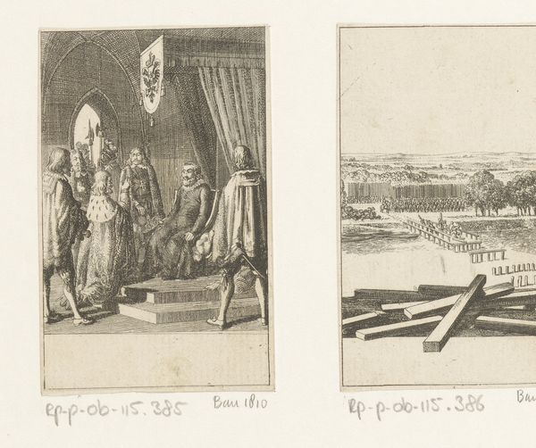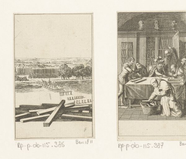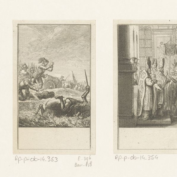 Editor: This is Daniel Chodowiecki's 1793 engraving, "Leopold verdrinkt tijdens zijn reddingsmissie," housed in the Rijksmuseum. The frantic scene on the left depicting a chaotic rescue juxtaposed with the solemn moment between a couple in the adjacent scene creates a striking contrast. How do we unpack these linked scenes, both separately and together? Curator: Let's begin by thinking about what is *not* depicted. Why do you think Chodowiecki focuses on this, specifically: a leader's supposed act of heroism culminating in tragedy? The composition guides us, doesn't it? Consider the social context of 1793; think about revolution and evolving ideas about leadership...does that help contextualize Chodowiecki's narrative choices here? Editor: I see what you mean. It almost seems to question the glorification of leaders by focusing on a futile effort rather than a successful triumph. The Romantic-era style lends itself well to this, focusing on emotional intensity. Curator: Precisely! This print allows for discussion on leadership, sacrifice, and even perhaps, the vanity of power amidst widespread suffering. What message is Chodowiecki communicating to his contemporary audience in portraying this dramatic, and somewhat ironic, "rescue mission?" Editor: So it’s not simply a historical depiction, but a commentary on leadership and perhaps the political landscape of the time. The emotional weight of the moment, emphasized by the composition and style, creates a narrative about more than just a single heroic failure. Curator: Exactly. It’s crucial to remember that artists respond to and shape the world around them. Art, then, becomes a powerful form of social critique. Editor: I never considered the artwork as something that encourages critical thoughts of societal issues. Thanks for opening my mind with these historical contexts! Curator: My pleasure. Hopefully now you can consider new possibilities for how art can influence political discourse!