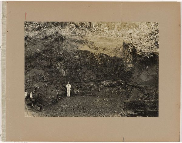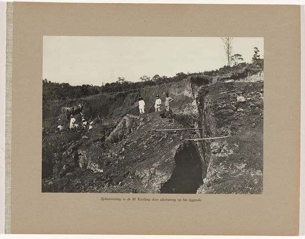 Curator: Look at this photograph, "Kollongdagbouw A2 Koollaag bij Tunnel 8," a gelatin silver print, captured sometime between 1921 and 1922. It is housed here at the Rijksmuseum. Editor: It’s a stark scene. The photograph presents this deep pit – immediately conveying a sense of excavation and almost unsettling emptiness. I see a stark contrast of light and shadow which amplifies the brutal nature of the site. Curator: Exactly. Let's consider the context. The image portrays a coal mine. This links it to the wider history of industrialization, a period defined by intense social upheaval, class struggle and resource exploitation. The dark pit and figures could be seen as representing the labor and lives extracted for fuel. Editor: Symbolically, it’s also a powerful image. The coal itself carries cultural weight as a source of energy and industrial progress, but the visual language here portrays the dangerous work, even the degradation of the earth for that fuel. The layering of wooden beams and shoring hints at a constant fight against collapse. Curator: And the presence of the workers in white clothes… It presents such a stark contrast in that grimy, muddy, industrial site. Considering contemporary conversations about ecological justice and labor rights, the image serves as a reminder of the often unseen human cost of development. It brings up questions of safety, fair labor practices, and who profits from these enterprises. Editor: Visually, the repetition of lines and structures almost has an echo to Piranesi, creating a dizzying perspective, a world created by and for this type of extractive industry. Those parallel lines also draw our eyes down and deeper into that unsettling void. Curator: The very process of photography, fixing a specific moment in time, suggests a desire to document this transformation. Photography itself becomes a tool in shaping perceptions of this industry, inviting consideration of whose perspective is being recorded. The work engages with crucial historical, social, and political dialogues. Editor: This photographic rendering carries immense power through stark symbolism, causing the viewer to grapple with our historical moment, its environmental costs, and human efforts. Curator: It provides a potent space to reflect upon progress and our continued dependency on resources.