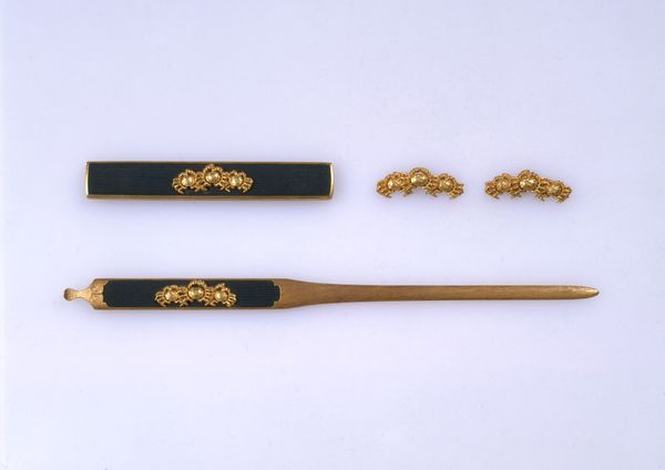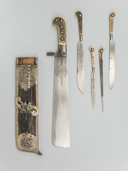 Curator: Look at this captivating object from around 1650. The museum catalogues it as "A Knife and Fork in Sheath." It's presented as a testament to Dutch Golden Age artistry. Editor: Oh, my goodness. Even something as simple as eating utensils feels so luxurious and ornate! The overall impression I get is that dining during the Golden Age wasn't just about food; it was theater. Curator: Precisely. Note the composition. A fork, a pick, and a knife with their ornately decorated ivory handles lay parallel with their protective sheath displayed alongside it. The artist focuses on the horizontal arrangement and decorative density, allowing our gaze to travel uninterrupted along its ivory axis. Editor: Ivory, metal and… linen, maybe, for the sheath? There's something almost medieval about the set. You know, it's like a knight's kit, only for banquets. Is it weird that the knife looks so well-used while everything else appears ceremonial? Curator: The knife's weathered blade introduces a dialogue between function and spectacle. Note how the artist's medium of metal interacts with time—introducing visual levels to the overall impact. Its utilitarian wear disrupts any semblance of pristine symmetry or ideal form. The entire setting transcends simple presentation by embodying this tension of eras. Editor: Right? It feels honest. The wear humanizes the object, tells a story of shared meals, lively conversation, perhaps. That knife connects us to some long-ago Dutch diner. I imagine them using it during raucous, Rembrandt-lit feasts. Did the paintings we see mirror their actual lives? Curator: We can assert that in the symbolic visual language employed, there is evidence the still life as a genre of art aimed to convey symbolic notions about mortality, ephemerality and indeed the pleasures of domestic life. But beyond its representation, how was its consumption determined through the act of observing itself. These considerations determine any meaning about art. Editor: That's heavy! Art consuming itself while depicting daily life. All I know is staring at it now, I’m craving a proper old Dutch cheese. And maybe thinking that even a humble meal can be, well, art. Curator: A resonant note to end on indeed; where visual experience shapes one's historical perception of quotidian pleasures within its rich context. Editor: Here's to fancy forks and even fancier food for thought!