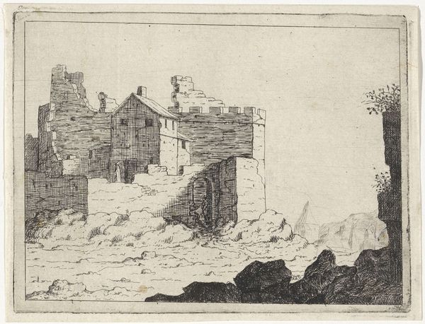 Editor: This is "Huis tegen een ronde toren," or "House with a Round Tower," a 1648 engraving by M. Schaep. The buildings feel almost precariously stacked together. How do you interpret this work based on its composition? Curator: I see a fascinating tension between the geometric regularity of the buildings and the seemingly "random" hatching lines used to define textures and shadows. The artist uses line variation, shifting from very fine, light strokes to dense, almost chaotic marks, suggesting weathering, age, and perhaps even a degree of decay. The strong contrast accentuates these features. Do you perceive this use of contrast as a dynamic element? Editor: I do see that now! The linework around the round tower really emphasizes the contrast, drawing my eye to it immediately. Curator: Exactly. Notice also the use of perspective. While present, it's not mathematically precise. The building's orthogonal lines do not converge at a single vanishing point. Instead, there's a slight distortion, which creates a rather flattened picture plane. Why might the artist make that compositional decision? Editor: Maybe to emphasize the architectural qualities and forms over realistic depth? Curator: Precisely. This prioritizes the structural interplay of shapes over a purely illusionistic rendering of space. Editor: That’s interesting, I hadn’t considered that flattening effect. It really changes how you look at the piece. Thanks! Curator: Indeed. By focusing on these structural elements, we gain a deeper understanding of the artist’s intentional choices and what they prioritize in their visual language.