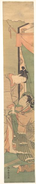 Utagawa Toyokuni I created this woodblock print of actors in 1796, a period of social transformation and cultural vibrancy in Japan. This print captures a moment from the Kabuki play "Seiwa Nidai Oyose Genji," with actors Kataoka Nizaemon VII and Iwai Hanshiro IV embodying their characters. Kabuki was a theater form that often explored themes of gender, class, and identity. Here, the actors, both male, play roles that traverse gender lines, reflecting the fluidity of identity within Kabuki tradition. The characters are rendered with expressive detail, which invites us to consider the emotional and social dynamics at play. The stern look of Kataoka as Iyo no Taro contrasts with the subdued demeanor of Iwai as Kojoro-gitsune, creating a tension that speaks to the complex narratives of power and vulnerability. This print, in its depiction of gender and performance, offers a glimpse into the ways in which art can reflect and shape cultural understanding.