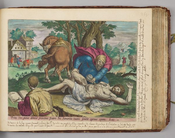 Editor: This is "The Good Shepherd" by Julius Goltzius. It’s a beautiful colored print. I’m curious about the tension between the figures in the foreground and the calm village in the background. What can you tell me about it? Curator: This print offers a lens through which to explore themes of power, protection, and vulnerability within 16th-century social structures. How does the imagery of the shepherd, often associated with religious authority, intersect with the depiction of the working class in the background? Editor: So, it’s not just a religious scene, but also a commentary on class? Curator: Precisely. Consider how the artist positions the shepherd in relation to the "flock," and also to the societal backdrop. What power dynamics might be at play? Editor: I see it now. I hadn't thought of it like that. Curator: Thinking about it this way opens up new paths for interpretation.