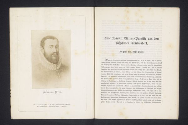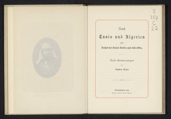 Curator: Immediately, I feel a distinct weight in the symbolism—that pith helmet is a loaded signifier. Editor: Indeed. We are looking at "Portret van Stephan Meyer met een tropenhelm," or "Portrait of Stephan Meyer with a Pith Helmet," created before 1881, likely a gelatin-silver print or albumen print. Note how the image is carefully arranged in a photograph album alongside text in German. Curator: The man's intense gaze, coupled with the exoticism implied by the helmet, stirs feelings of both adventure and... a certain degree of assumed authority. It’s an interesting blend. Is that authority earned or conferred by the cultural assumptions that pith helmet represents? Editor: Precisely. Consider the history—photography, like this print, became instrumental in constructing and reinforcing colonial narratives. This portrait is likely connected to publications about North Africa. The pith helmet, therefore, doesn't just represent travel; it evokes colonial administration, military campaigns, and an assumed position of superiority. Curator: And within that symbol lies a complex tension—the spirit of exploration mixed with a shadow of power. It reflects back a time when images played a key role in forging perceptions and power dynamics. His rather substantial beard also reads of authority. Editor: Absolutely. The portrait format itself also contributes to the feeling. He is meant to be seen as a figure of import, yet the photographic medium suggests both accuracy and the possibility of mass reproduction—which only amplifies the image’s reach and potential ideological weight. Curator: It is also very clearly posed, not a snapshot, contributing to that image-making, a deliberate constructing of self and presentation, one designed to be visually legible to a European audience. Editor: Considering how portraiture served colonial agendas, the "accuracy" becomes secondary to the values that these images were mobilized to advance. Curator: Yes, thinking about the images in albums, what stories are intentionally being written in and around these photographs, what is not being documented—what remains invisible? Editor: Exactly. This album likely sought to establish, circulate and affirm perceptions about specific geographic locations, people, and the dynamics between colonizer and colonized. Curator: Well, analyzing it, one realizes that even a simple portrait in an album can be a carrier of weighty history and ideology. Editor: Indeed. And by deconstructing these symbolic images, we better recognize their lasting effects on collective memory and cultural identity.