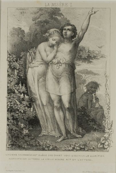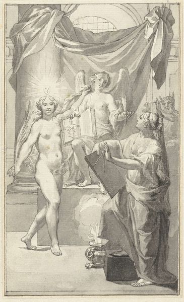 Curator: Welcome. Today we’re looking at “Minerva en Venus,” an intriguing drawing held here at the Rijksmuseum. Its creation is dated somewhere between 1700 and 1800. Editor: Hmm, a peculiar little scene! Minerva and Venus together like this… it’s strangely comforting, in a slightly severe, classical way. The pencil strokes are delicate, yet there’s a robust tenderness, don't you think? Curator: Definitely intriguing. Looking closely, you see the anonymous artist utilizes pencil to achieve very precise, classical-realist lines. Given the subject matter, the linear precision fits perfectly with academic artistic conventions. And how fascinating that it is in monochrome and that the two goddesses stand close to each other in the oval. Editor: Absolutely, the monochrome heightens the dreamy quality. And the placement… they’re almost leaning on each other. Like a study of contrasts – wisdom in armor and beauty unadorned finding a bizarre moment of solace. There's a strange tenderness, as I said, in that unlikely camaraderie. What narrative purpose could this have served? Curator: Considering the probable period of creation, the work reveals how labor shaped both the physical representation and the cultural understanding of beauty and power. Minerva's armor, the spear, and the theatric mask denote power in terms of material culture and technical craftsmanship—labor. Meanwhile, Venus exhibits another ideal formed via different means, possibly different material relations if we speculate about this further. Editor: It feels like more than just technical prowess at play. There is such a compelling human element that resonates even now. Perhaps this meeting embodies a reconciliation of different kinds of knowledge – the warrior’s practical experience blending into a more spiritual wisdom or perhaps the reverse is also true, to arm love and desire in strength. Curator: An interesting reading, indeed. It is easy to see in its careful construction and in the material limitations something fundamental regarding 18th century cultural aesthetics, revealing broader economic and cultural frameworks of that time. Editor: I agree. So even just a relatively brief consideration highlights a meeting of two heads and a meeting of artistic technique. Very beautiful. Curator: Yes, a brief but illuminating journey into the dynamics of this work's place within art history.
