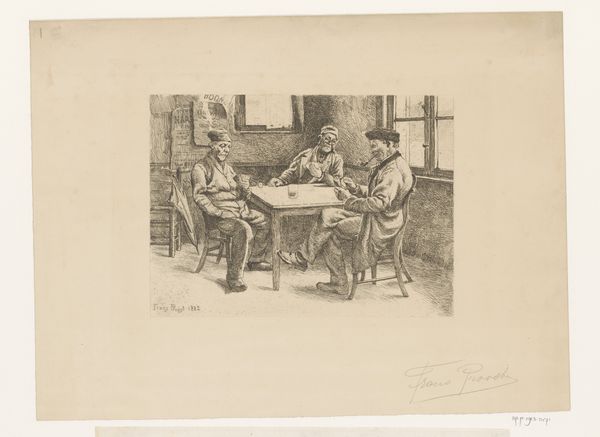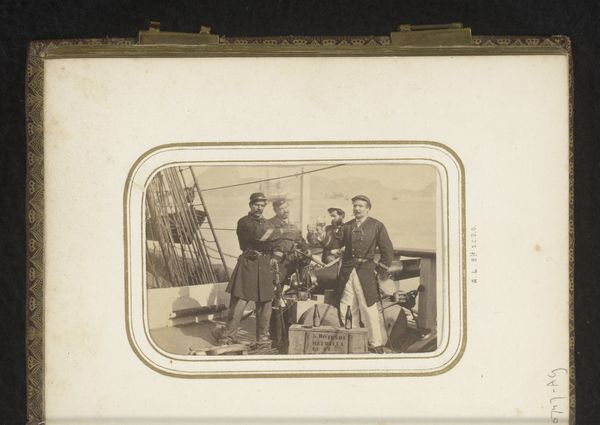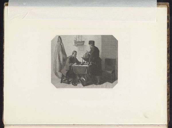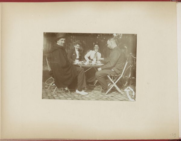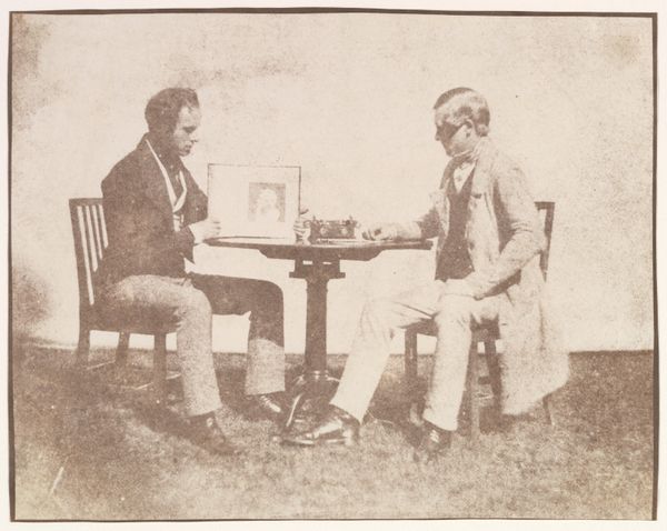Editor: Here we have William Henry Fox Talbot's "Group of Gentlemen Conversing over a Glass of Wine," created in 1846 using photography, ink and gelatin silver print. It almost has the feel of a candid snapshot, despite the medium being so early in photography's development. What catches your eye in this tableau? Curator: For me, it’s all about the context of production. This isn’t just a photograph; it’s an early experiment in capturing social life using emerging technology. Consider the labor involved in setting up the shot, the preparation of the chemicals, the constraints of exposure time. Look at the table: the wine bottle, the pitcher, the table cloth. Do you see a social stratification hinted at here through access to materials and leisure? Editor: That's a great point. The leisure aspect, for sure! I hadn't really considered the physical labor involved with photography back then. Curator: Exactly! These early photographs were arduous processes. We’re so accustomed to instant photography now, but think of the chemicals involved, the sourcing, and who controlled that production. Consider the ink used. What kind is it, and what does that say about the economic reach of the subject and the photographer himself? Editor: It’s like these materials—ink, gelatin silver, even the wine and cloth on the table—speak volumes about the conditions of 19th-century life. I mean, it’s almost like still life *becoming* a live moment... Curator: Precisely! And what does this transition mean for our understanding of realism versus representation? Were these materials readily available, or luxurious items carefully curated? It affects how we read the final product and who it was made for. Editor: Wow, I never thought about it like that before. Focusing on the material conditions really does give it a whole new layer of meaning! Curator: Seeing the artwork through the lens of materiality really emphasizes the social and economic factors intertwined with its creation.