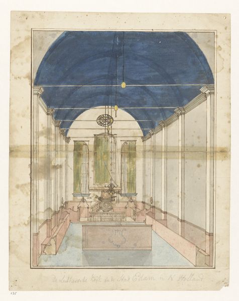 Editor: This watercolor painting, “Evangelisch Lutersche Kerk binnen de stad Batavia in Oost-Indië,” created around 1785 by Jan Brandes, offers an interior view of a church. It feels very formal and orderly to me, but also quite… removed. What can you tell me about this piece? Curator: This is a fascinating record of a specific time and place. The scene itself, the Evangelical Lutheran Church in Batavia – now Jakarta, Indonesia – resonates with layers of meaning. Look at the almost architectural precision. It mirrors the societal structure of the Dutch East India Company's colonial presence, wouldn't you say? The light and airy space doesn't mask, but rather subtly highlights the rigid social hierarchy of the time, frozen like insects in amber. Editor: That’s a really interesting point about the rigidity. The perspective emphasizes the different levels so clearly. What symbols stand out to you in the scene? Curator: The organ, prominently placed, carries immense weight. Music, especially in religious contexts, signifies both spiritual uplift and social cohesion. In a colonial setting, consider how it functions – as a symbol of European culture imposed within an entirely different cultural context. Is it bridging divides, or emphasizing the separation? Notice also the almost clinical way individuals are arranged within pews. Their cultural memory seems subsumed within the structure of the space itself. What do *you* make of the positioning of figures, carefully divided by gender and status, perhaps? Editor: I didn’t pick up on the organ's symbolic imposition, but it’s such an obvious symbol once pointed out. Thank you! It completely changes my perspective of the painting. Curator: Exactly! That interplay is what makes art history so endlessly engaging. Seeing these images for their deeper context reveals much about humanity's development.