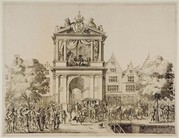 Salomon Savery etched this print in 1638, depicting the arrival of Maria de' Medici at the Varkenssluis triumphal arch. Here, the arch is the dominant symbol. Arches, since Roman times, represent victory and honor. This motif of triumph echoes through centuries, seen in Roman imperial entries and Renaissance festival books. Consider, though, how the arch has evolved: initially a symbol of military might, here it frames a queen, suggesting a shift towards celebrating political power and dynastic succession. The arch taps into our collective memory, triggering subconscious associations with power and authority. It is more than stone; it is a stage upon which the drama of history unfolds, engaging viewers on a deep, emotional level. The arch has resurfaced, evolved, and taken on new meanings in different historical contexts.