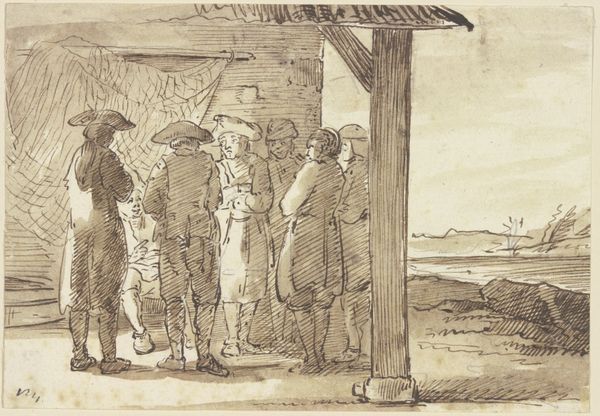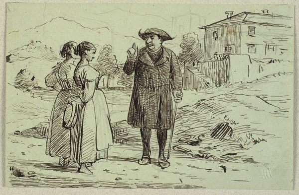 Editor: Here we have Wilhelm Marstrand's pen drawing, "Outside a House, a Priest Admonishes a Young Couple," created sometime between 1810 and 1873. I'm struck by the artist's detailed use of line to convey form and texture. What do you see in this piece from a formalist perspective? Curator: Note the composition, where figures are arranged in a tight, almost stage-like space. Consider the rhythm established by the linear hatching. How does the artist use these lines to create a sense of depth and volume, and how does this visual language influence our perception? Editor: I see that the dense lines give the figures a weighty presence, but there's also a nervous energy to them. Is that purposeful? Curator: Precisely. It's in the tension between the solidity achieved through line and the open, almost unfinished quality of the sketch itself. Look closely at how the artist varies the density and direction of the lines. Observe how Marstrand utilizes the white space of the paper. In essence, the formal properties do not simply illustrate; they actively generate meaning within the artwork. Editor: So, by focusing on the artist's choices—the pen strokes, the figure placement, and how the composition directs our eye—we can better grasp the essence of the artwork, even without external context. I see it now! Curator: Absolutely, focusing solely on form and structure provides a rewarding pathway. We discern the intentionality and visual relationships to generate a unique appreciation for the artwork.