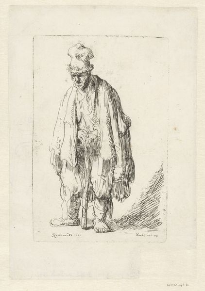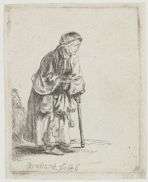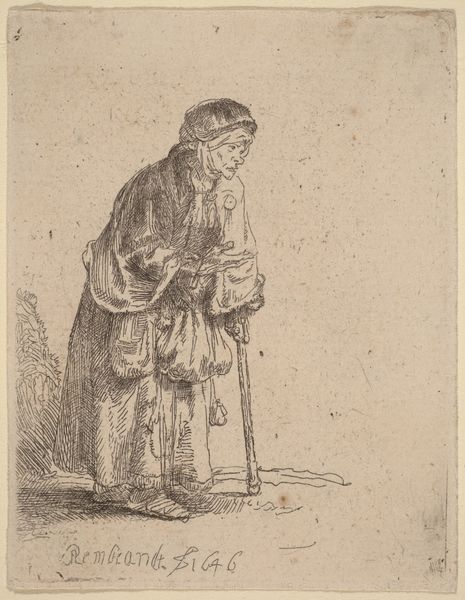 Rembrandt van Rijn created this etching of a beggar woman leaning on a stick. During the 17th century, the Netherlands experienced significant economic growth alongside stark social inequalities. Rembrandt, living in this era, often turned his gaze to those on the margins. Here we see an elderly woman, her body worn and bent, a simple stick her only support. Her clothing is tattered, and her face etched with the hardships of poverty. What does it mean to depict such a figure? Is it an act of empathy, a social commentary, or something else? Perhaps it's a mirror reflecting the artist's own vulnerabilities, as Rembrandt himself faced financial difficulties later in life. The image quietly challenges the viewer to consider the human cost of progress and the dignity of those often overlooked.