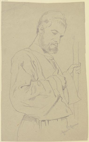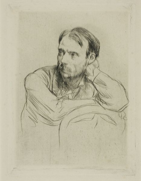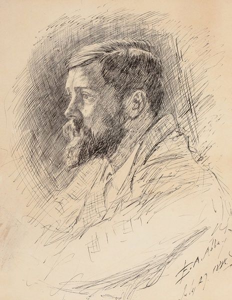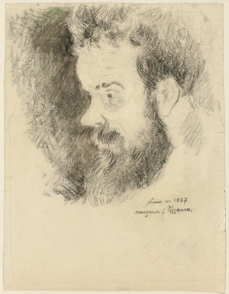 Editor: Here we have Hans von Marées' "Portrait of Peter Bruckmann," created around 1883. It's a drawing using what appears to be red chalk and possibly pastel. I find the overall effect quite subdued, almost like a fading memory. What elements stand out to you in terms of its form and structure? Curator: Initially, the interplay between line and form is captivating. Consider how the artist employs hatching to delineate the subject's features, building volume through the density and direction of these marks. Notice, also, the economy of line, where the suggestion of form is prioritised over exact replication. What impact does the limited palette of the drawing have on your understanding? Editor: The monochromatic red chalk definitely focuses my attention on the shapes and lines themselves rather than being distracted by colour. I can appreciate how that contributes to the emphasis on form that you mentioned. Does the technique of hatching, that network of parallel lines, tell us something about Marées' artistic approach? Curator: Precisely. The strategic use of hatching provides texture and depth, thus engaging a beholder more fully in the opticality of the piece. However, it is also of note the areas that the artist leaves unresolved or vague. Note the background is scrubbed but vague, creating dynamism through its juxtaposition with more focused and resolved elements such as the figure's eye or beard. Why do you think the artist might have chosen such a varied approach? Editor: Maybe to highlight the face and draw attention there, whilst not distracting from other parts. Looking closer, I see how much the lines build up the texture of his beard and hair too. This makes me really see how important mark-making is. Curator: Indeed. And such deliberate construction emphasizes the inherent qualities of the medium itself and the artist's hand in its manipulation. I have really enjoyed you bringing this piece to my attention today. It seems such a wonderful illustration of medium defining an artist’s voice.