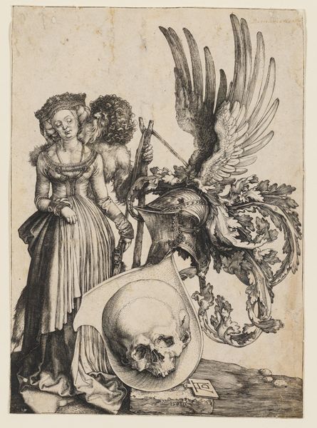 Curator: This is Albrecht Durer's "Coat of Arms with a Skull", created in 1503. It’s a captivating example of Northern Renaissance engraving, currently held in a private collection. Editor: Whoa, it’s intense! The skull on the shield—heavy imagery. And yet, the flowing lines give it a strange elegance. Almost decorative, but dark. Very dark. Curator: Indeed. Durer was fascinated by the symbolism of mortality. Here, the coat of arms usually representing lineage and status, is juxtaposed with the skull, a "memento mori." Editor: So, a sort of stylish reminder of our inevitable end? The contrast is striking, you've got this maiden – serene and lovely, then WHAM! A winged helmet that sprouts like, death ferns next to this angelic being. Talk about mixed signals. Curator: It is very characteristic of the period, though, a fusion of humanism and the ever-present awareness of death. We also have this rather feral wildman that accompanies the crowned woman which creates interesting power dynamics, perhaps representing humanity, savagery, the duality of human nature, right beside emblems of civic authority and class. Editor: Absolutely! That wild man with his club – is that like, id? He makes that whole lady/skull sandwich even more layered. It’s making me rethink what exactly someone considered beautiful back then... It’s kinda hardcore beautiful. You know? Curator: You are not off-base. The patrons in that historical period understood a far richer iconography when it came to symbolism. Durer's innovative fusion of traditional heraldry with potent symbols of mortality reflects a culture grappling with change. It also reflects shifting spiritual attitudes and values that he explored with a keen sense for aesthetics, of course. Editor: Looking at all the symbolism, and the skill behind the engraving…makes it feel so timeless. Death and beauty? Always gonna be in style, I guess. I mean, as much as "style" exists outside of human perspective. Anyway, very provocative stuff. Curator: It really does capture the spirit of the Renaissance so wonderfully. Durer provides us with more than just an image but an important and historical mirror to ourselves. Editor: Agreed! Definitely gets you thinking…or maybe *not* thinking. Pretty metal either way.