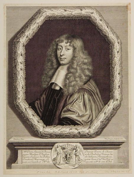 Curator: This engraving, created in 1661 by Pieter van Schuppen, depicts the Portrait of Pierre Ignace de Braux. It's currently held at the Rijksmuseum. Editor: It's so precise, almost photographic in its detail, particularly the subject's elaborate hair. But there's a coolness to it. It feels more like documentation than an attempt to capture a personality. Curator: The line work certainly emphasizes a clinical realism, wouldn't you agree? The engraving technique lends itself to the almost scientific detail apparent here. Notice how van Schuppen meticulously renders textures from the ornate wreath surrounding the portrait to the velvet and lace. Editor: The abundance of embellishment, from the laurel wreath to the inscription and heraldic crest beneath, screams of the Baroque period’s embrace of opulence as an indication of social status and authority. We have this very controlled image, set against symbols declaring his pedigree. It presents an ideal rather than an individual. Curator: The framing composition guides the viewer's eye. From the symmetrical placement of the wreath to the centered crest, everything enhances a sense of equilibrium and order. The choice of the octagonal frame is also compelling – less common than a circle or rectangle, yet perfectly suited here. Editor: It’s fascinating how portraiture functioned during this era. Here, the display of nobility seems to overshadow the person. How much of what we’re seeing is about historical accuracy and how much about upholding societal hierarchies? And where does the museum, as an institution, factor into preserving and even reinforcing these notions? Curator: Precisely! Looking closer, it reveals that this engraving isn't merely an artwork. Instead, it’s a careful performance designed to situate de Braux within a very particular historical narrative. Editor: Thinking about that carefully constructed persona you mentioned makes me reconsider my initial feeling of coolness. There's something intriguing, and intentionally distant, about this figure positioned so deliberately within his world.