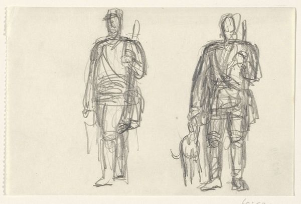 Leo Gestel made this sketch, with pencil on paper, as a draft poster for army propaganda. The composition is dominated by three studies of a soldier. The figures, rendered with quick, assertive lines, show an interest in form and movement, even at this early stage. The use of line is particularly striking; Gestel doesn't outline the figures conventionally but uses layers of strokes to suggest volume and shape. This technique captures the essence of the figures and a sense of dynamism. The pencil lines create texture, hinting at the material of the soldier's uniform and equipment. These rapid lines, almost scribbled, convey a sense of immediacy. The absence of color directs our attention to the form itself. The contrast between the white paper and the graphite lines offers a visual structure that is both simple and profound. It's through this carefully considered deployment of line that Gestel begins to construct a narrative, prompting reflection on the role and representation of soldiers in propaganda art.