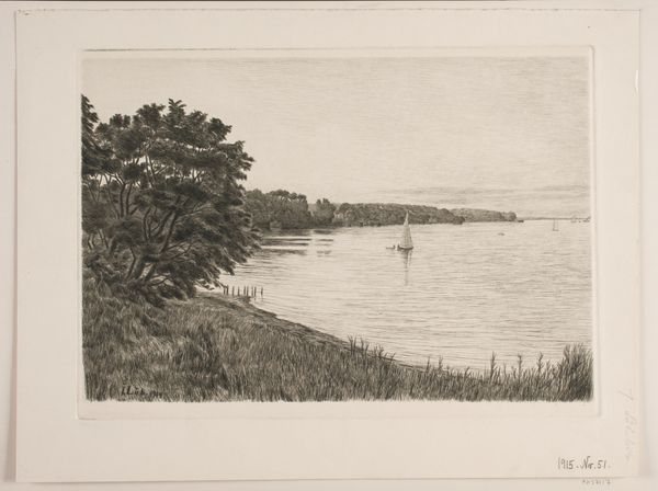 Curator: This delicate print from 1899 is titled "Udkast til Den grimme ælling" which translates to "Draft for The Ugly Duckling". It is by Christian Kongstad Petersen, rendered in etching, ink and pencil. Editor: A melancholy washes over me as I look at it. There’s something lonely about that solitary swan against the wide, undefined sky. Curator: Notice how Petersen uses etching to create a textured effect in the landscape and the water, yet keeps the lines delicate to convey both light and shadow. It almost dissolves into mist as your eye moves back toward the horizon line. What about the compositional balance, how does that influence your experience of melancholy? Editor: It's in the asymmetry; the land on the left is dark and weighty, offset by the swan on the other side, which feels exposed. Petersen uses that contrast between darkness and light, density and open space, to convey that tension inherent in the story of the Ugly Duckling – the alienation and struggle. But is this artwork necessarily about that Hans Christian Andersen fable? Curator: While the title invites that reading, consider the materiality; the fine etching and delicate lines almost seem at odds with the harsher realities of social isolation and discrimination. Editor: But surely it is the very gentleness of Petersen's chosen method, combined with the social awareness gaining strength in 1899, that highlights this precise dissonance; Petersen encourages viewers to contemplate a vulnerable subject with empathetic eyes. Curator: So you believe Petersen to be taking a social position through aesthetics? It would seem he balances technical observation with political intent through chosen symbols within this drawing. Editor: Indeed. To me this evokes how beauty exists for all but is only rewarded to the selected. The dark heavy shore has an absence of such beauty, much like the life of a ostracized ‘Ugly Duckling’. Curator: Perhaps Petersen sought to express these concepts within an aesthetically beautiful and formally concise visual statement, leaving layered potential meaning for us to unravel. Editor: Yes. It invites consideration, doesn't it?
